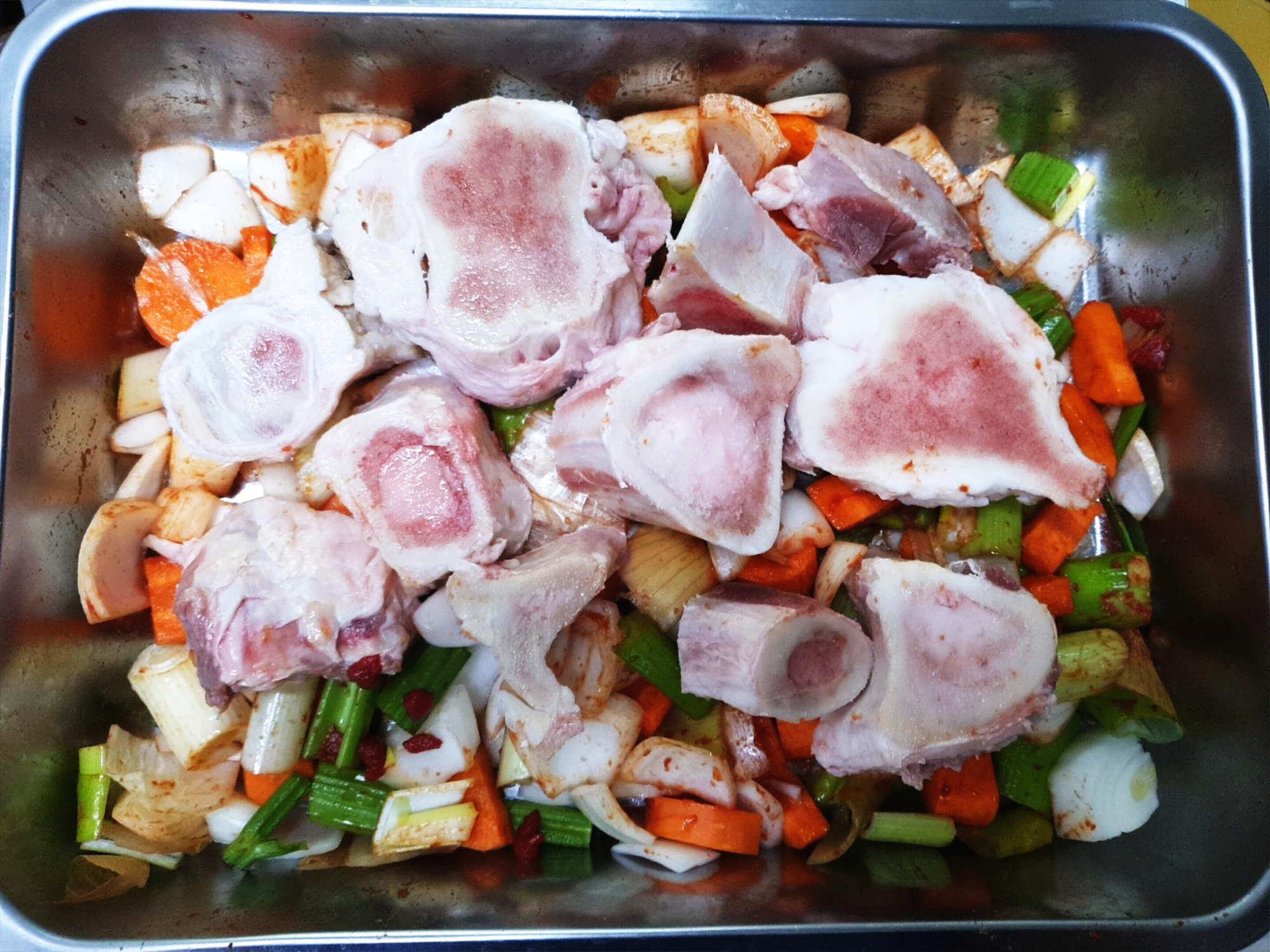 보시면 골수가 있는 거를 사용하시는 게 좋습니다. 그리고 야채는 토마토 페이스트와 기름을 이용해서 한번 버무려 주시면 돼요.