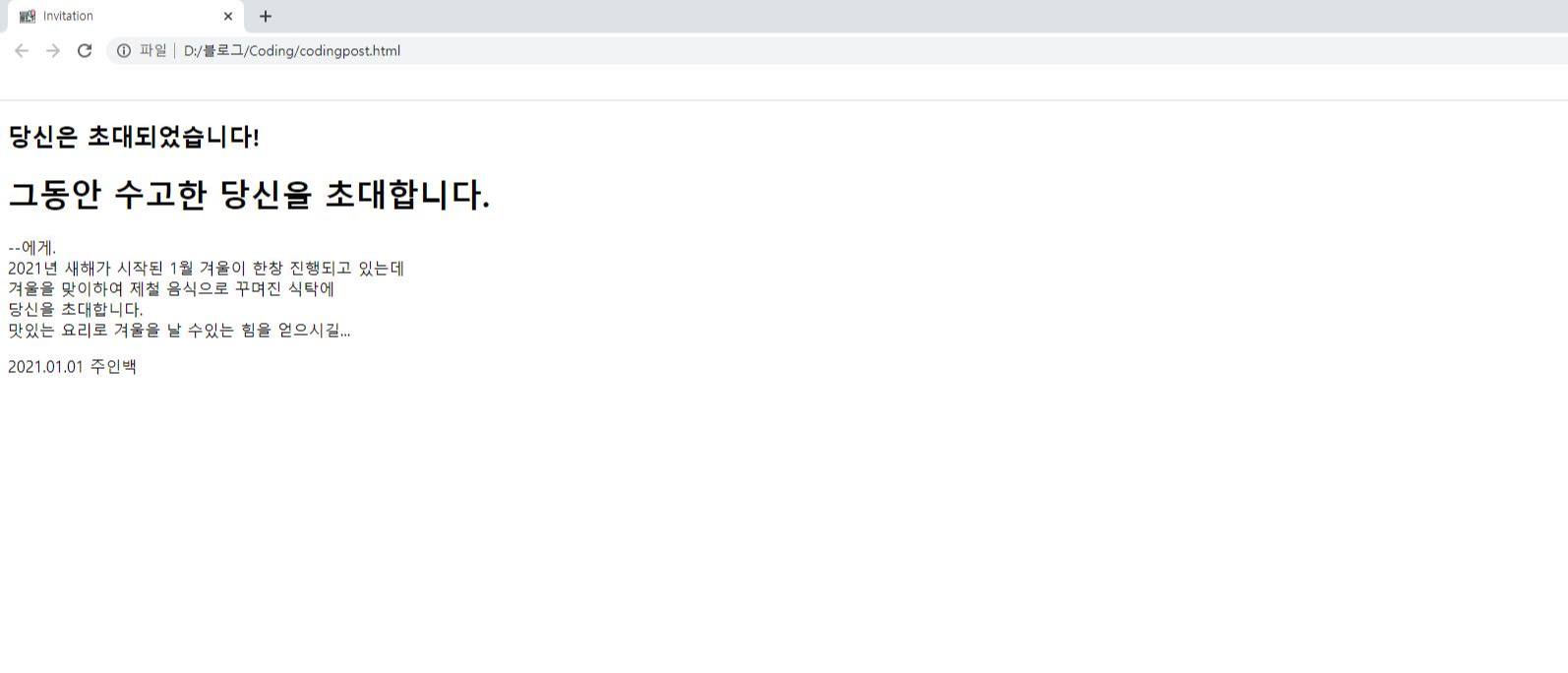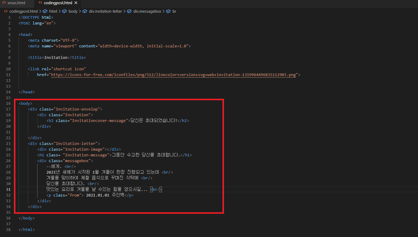 이 부분에서는 구조를 머릿속에 먼저 그리고 하는 것이 좋은데 이번 스파르타 코딩에서는 한 페이지에 편지봉투와 편지 내용을 모두 만들고 javascript의 style.display를 이용해서 클릭 시에 보여주는 형식을 따르고 있다. 물론 클릭했을 때 다른 페이지로 가는 것도 만들 수 있지만 그럼 웹페이지를 2개 만들어야 하기 때문에 굳이... ㅋㅋ