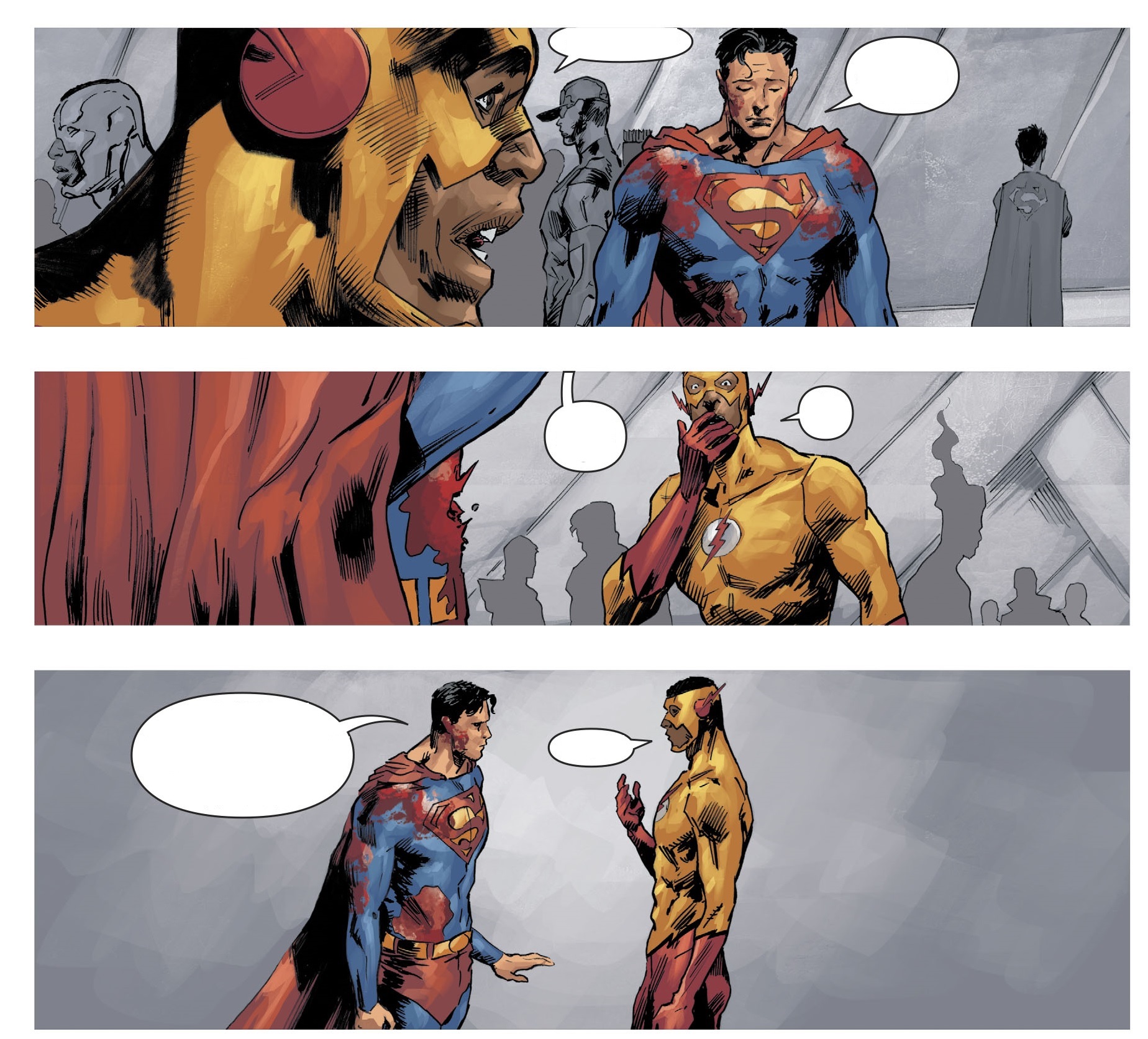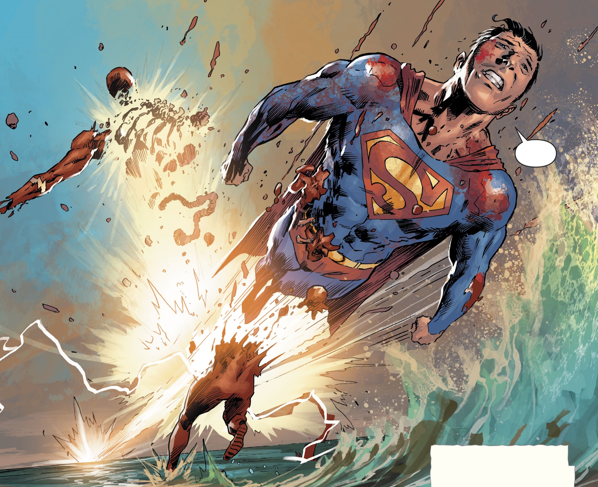 Kid Flash가 자신이 Flash를 잡겠다고 하지만 Superman은 자신이 하겠다고 합니다. 그리고 Flash가 죽은 것을 확인한 Superman은 Flash와 같은 속력으로 반대편에서 날아와 Flash와 부딪혀 Flash를 터트려 버립니다.