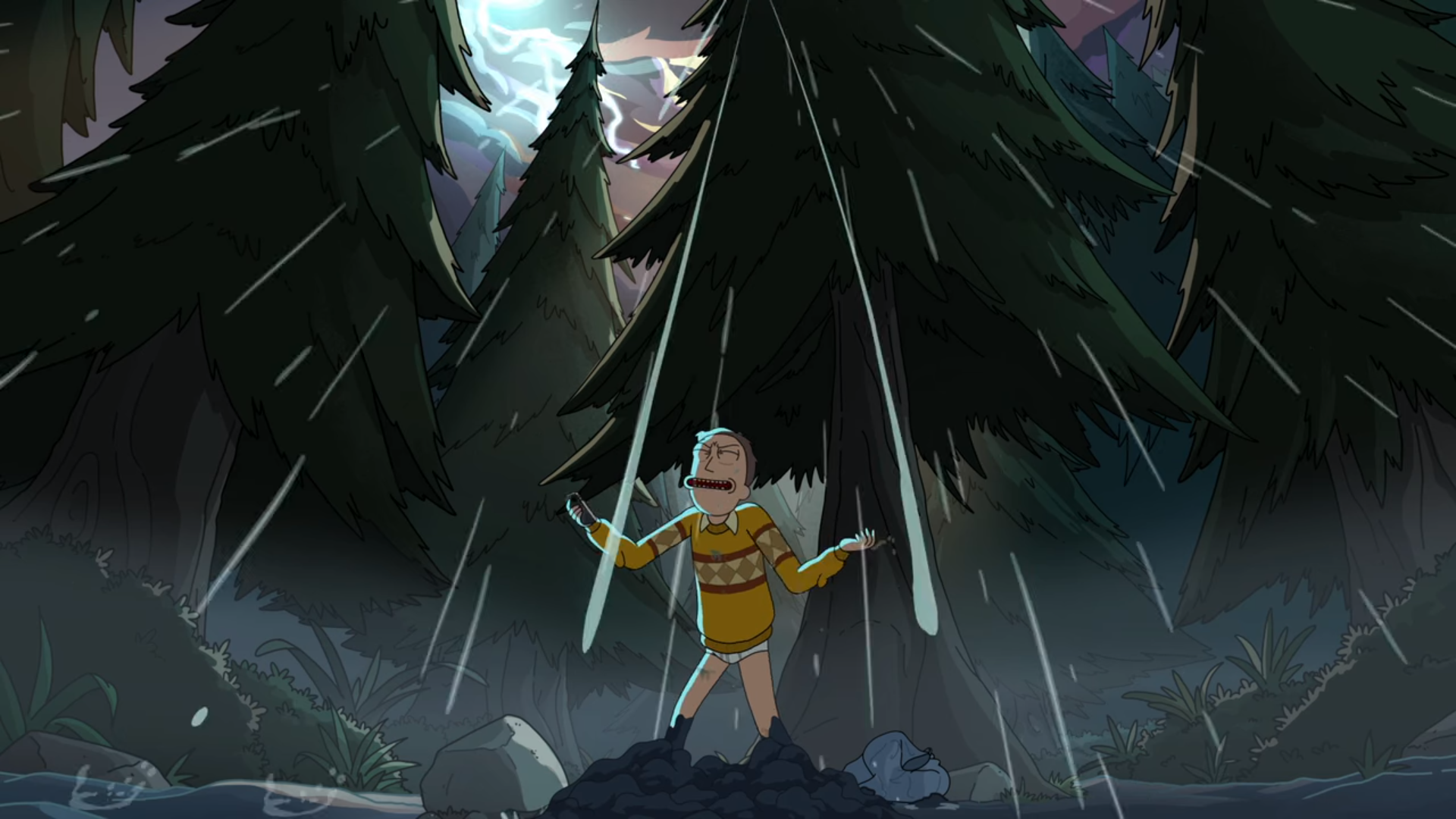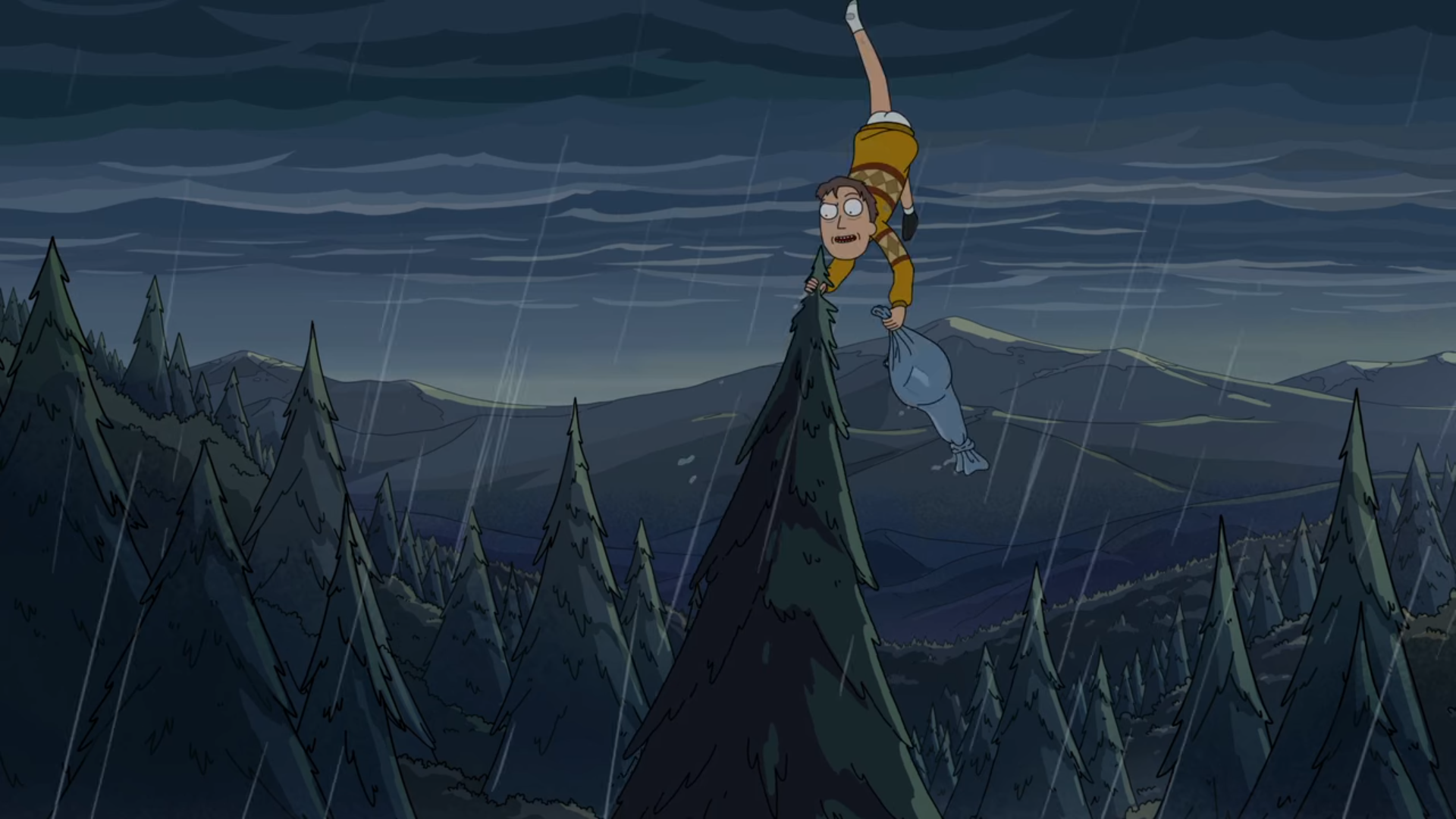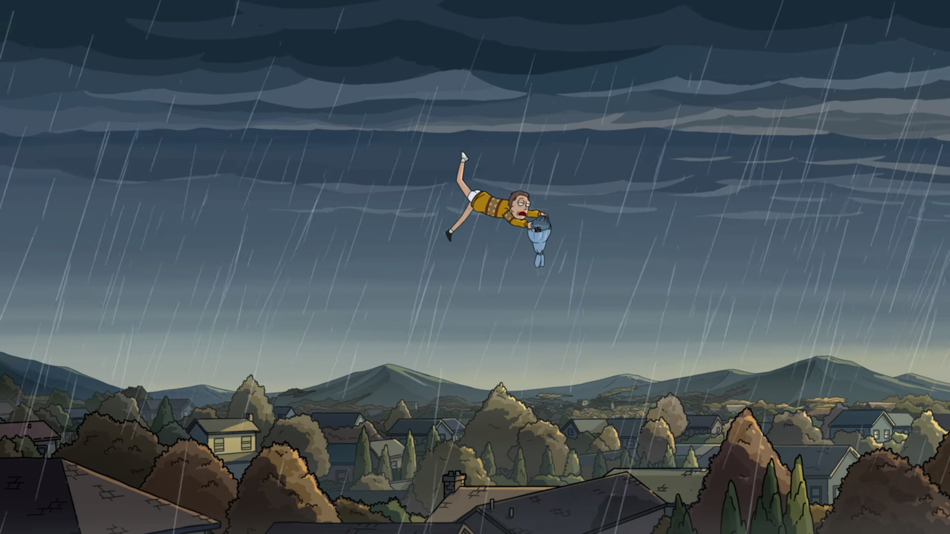 Rick과 Morty, Summer는 보드게임을 하고 있습니다. 그런데 Beth가 와서 Jerry가 어디 있냐고 물어보는데 아무도 어디 있는지 모르죠. 그러자 Morty는 Rick이 Jerry를 둥둥 떠다니게 만들었다고 합니다. 그러자 Beth는 Jerry가 죽을 수도 있다고 하지요. 어쩔 수 없이 Beth와 Rick은 Jerry를 찾으러 갑니다. Jerry는 하늘에 떠서 바지를 묶어 빗물을 받고 있습니다. 그래야 지상으로 내려갈 수 있으니까요.