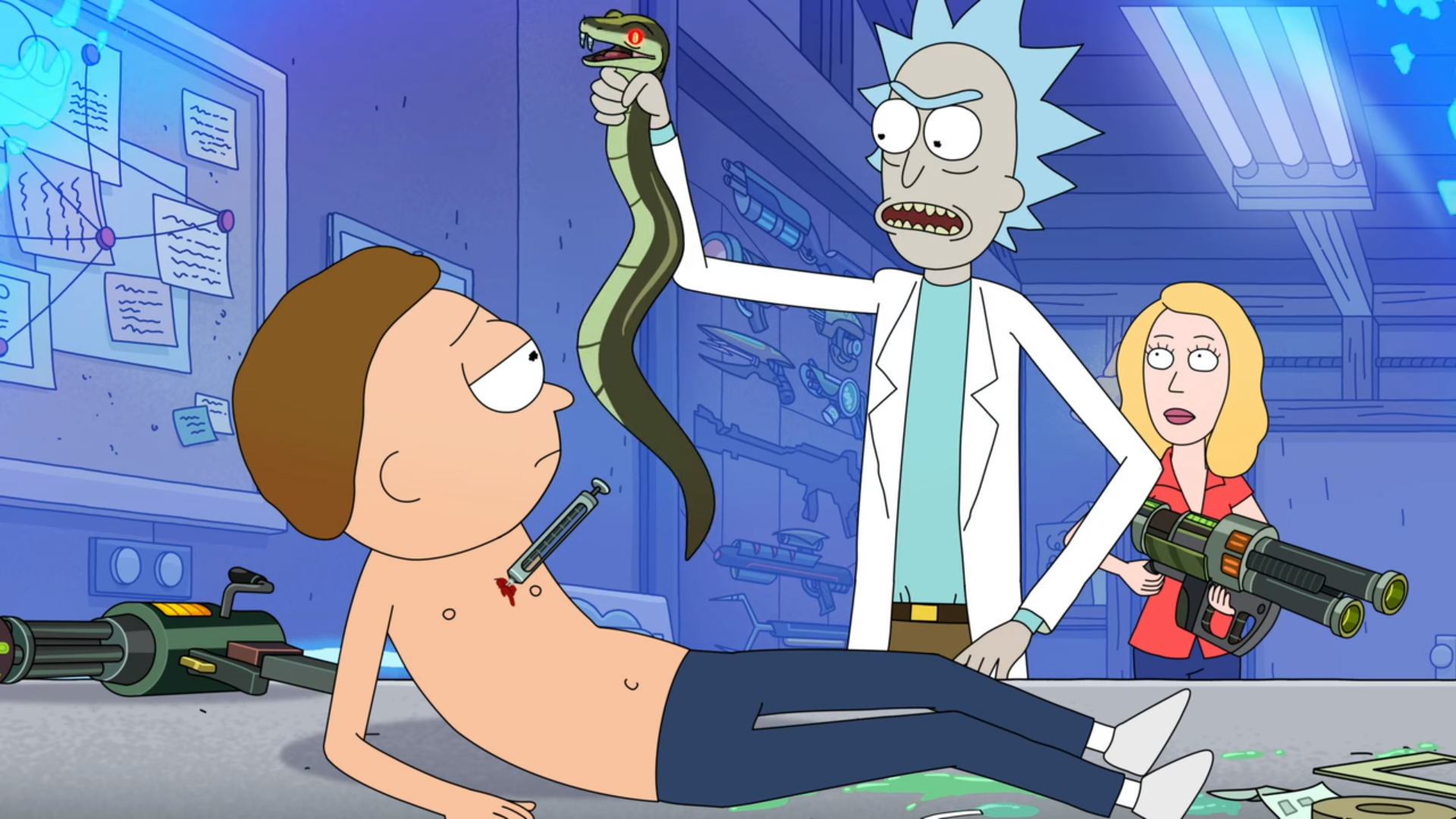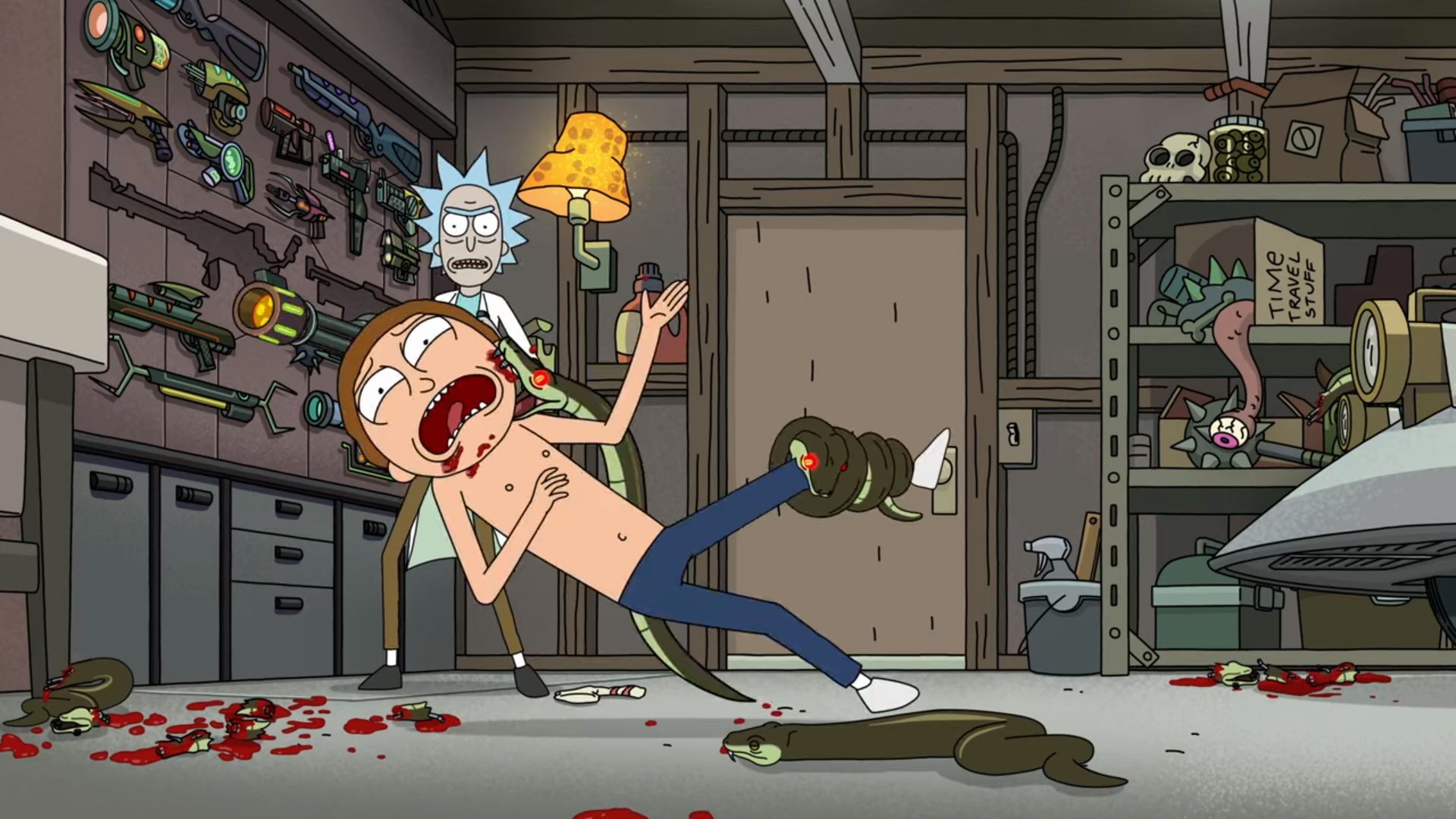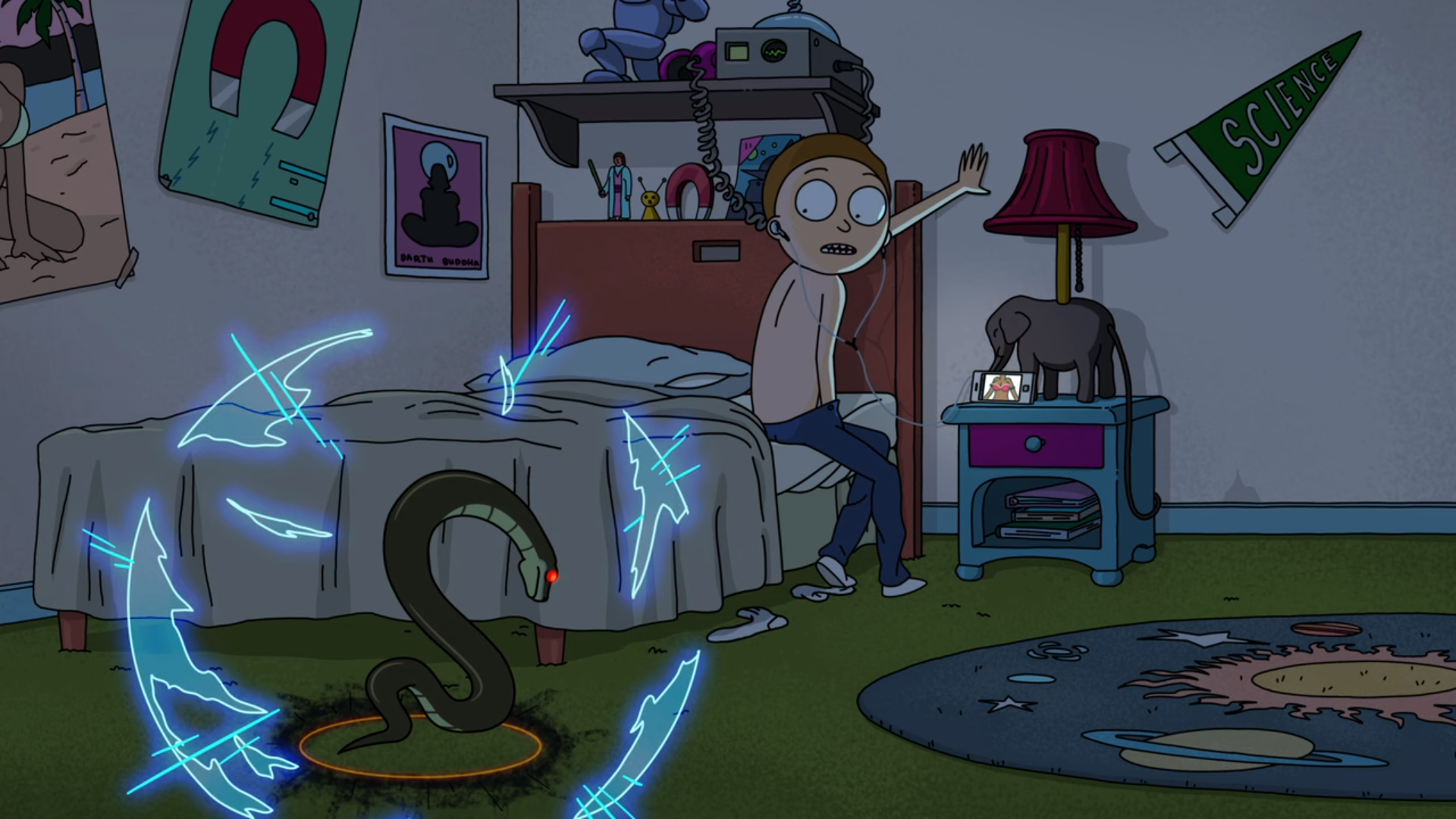 Morty에게는 갑자기 뱀들이 시간 이동을 해서 Morty를 죽이려고 합니다. 그리고 다른 뱀이 나타나 Morty를 지켜주지요. Beth와 Rick은 집으로 돌아와 Morty를 돕습니다. Rick은 Morty가 잘못해서 이런 일이 생겼다는 것을 알아채고는 다음부터는 우주에서 차에 가만히 있으라고 윽박지릅니다.