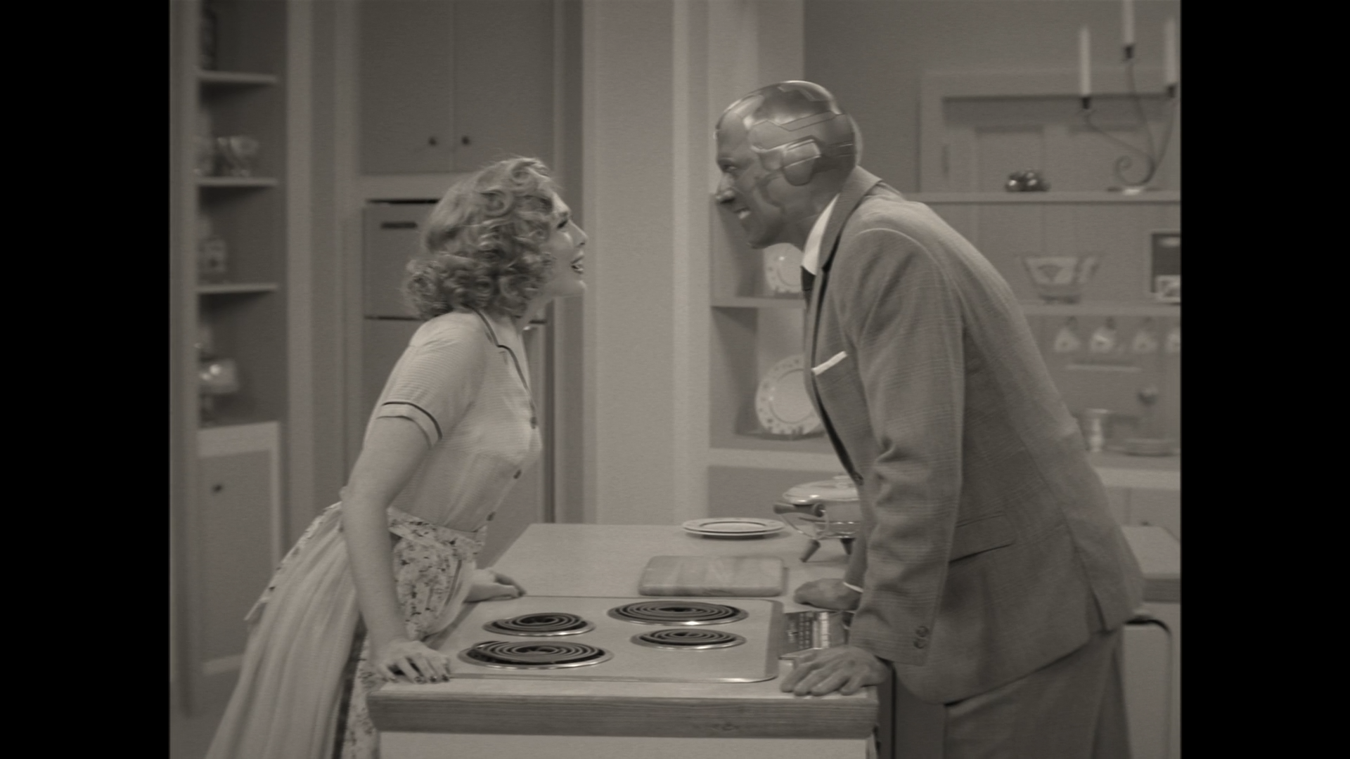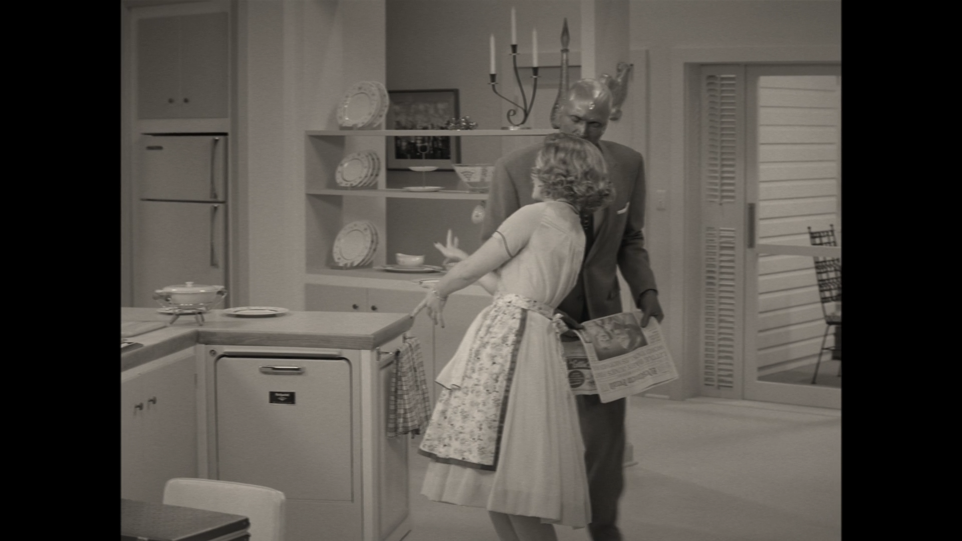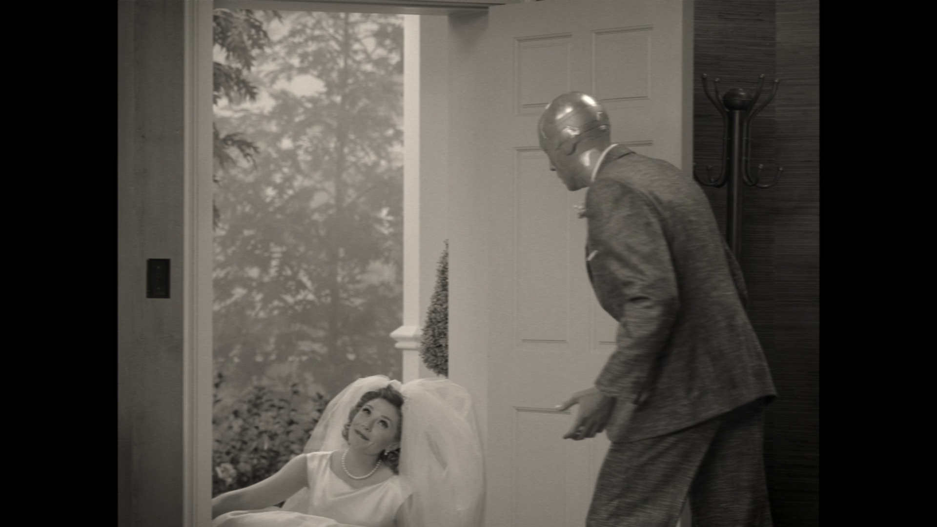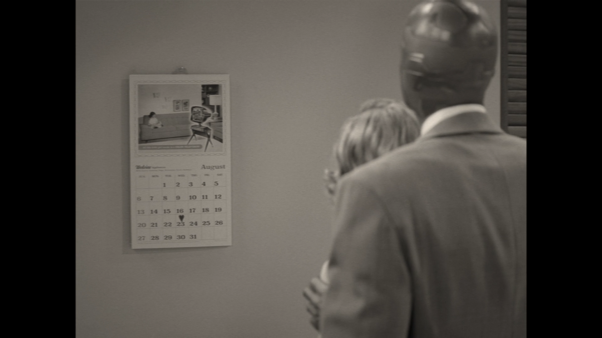 하지만 무슨 기념일인가를 둘 모두 알지 못하지요. 둘은 서로 아는 척을 하면서 무슨 기념일 인가 말해보라고 하지만 좋은 날이라고 하면서 대답을 피합니다. 그렇게 그냥 알겠다고 얼버무리면서 Vision은 직장으로 떠납니다. 그리고 Wanda는 집에서 여전히 무슨 날인지 궁금해합니다.