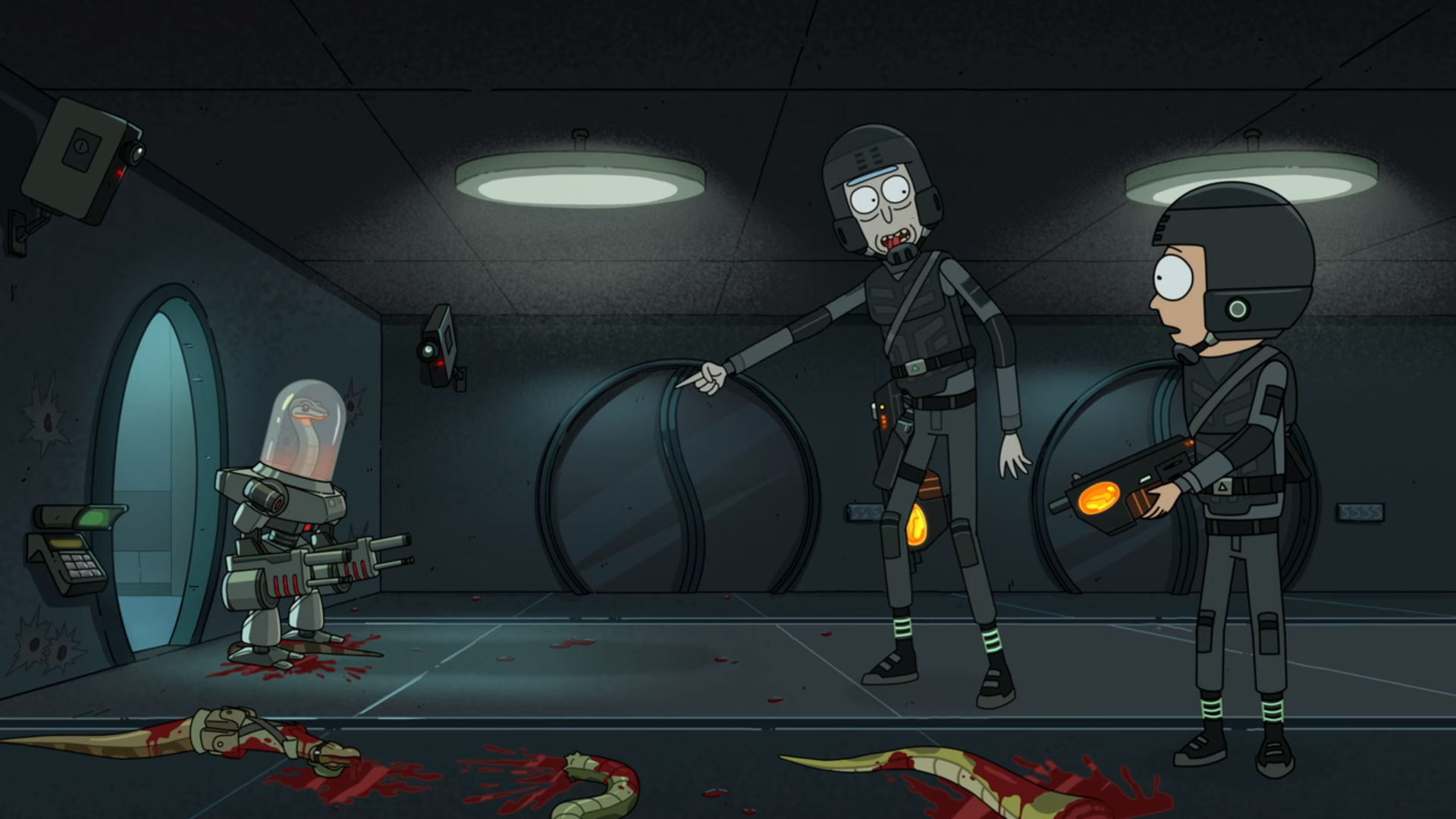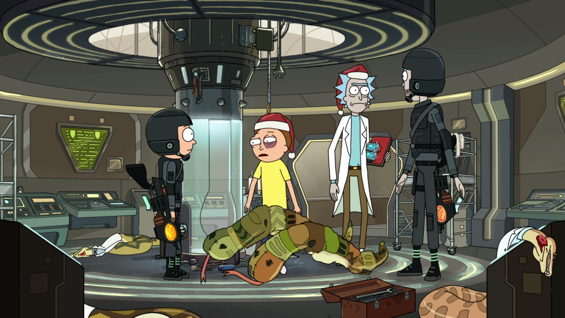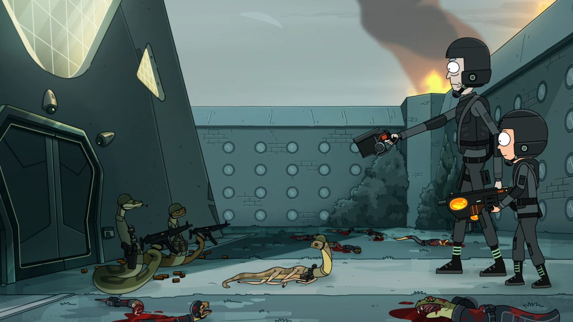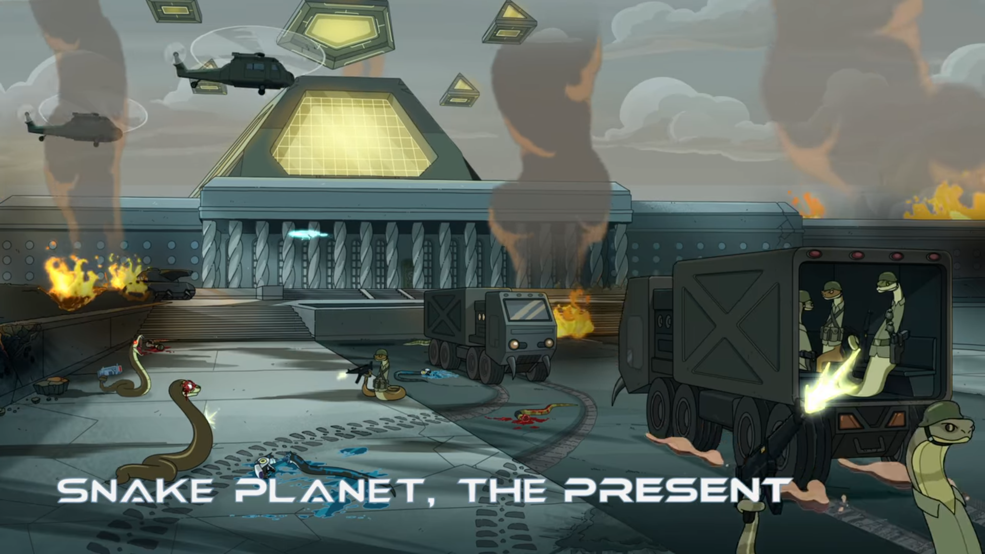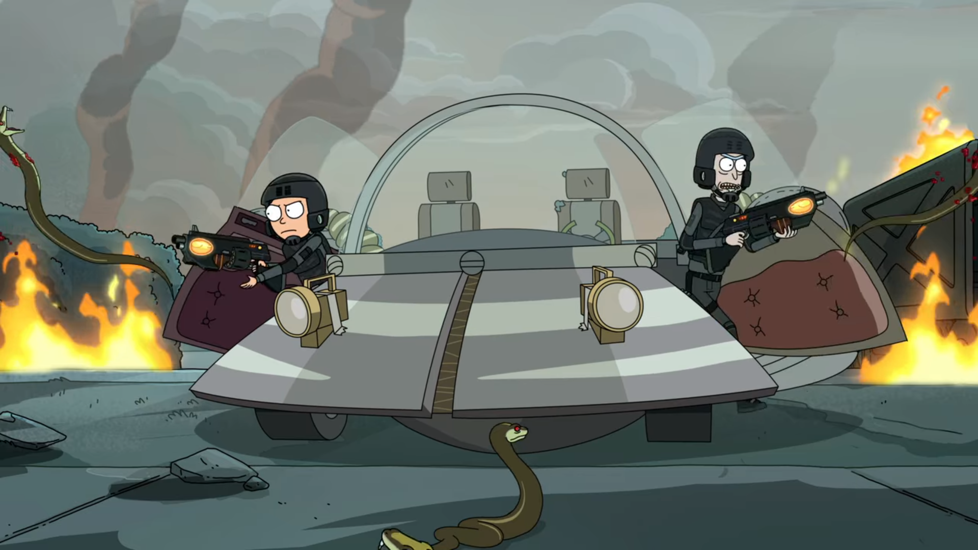 현재로 돌아와서 뱀 행성은 미래에서 온 기계 뱀들과 그 기계 뱀을 저지하기 위해 온 뱀들과 유지군들이 전쟁을 하고 있습니다. 그리고 Rick과 Morty는 이곳에서 타임머신을 없애기 위해서 전쟁 한복판으로 들어갑니다.