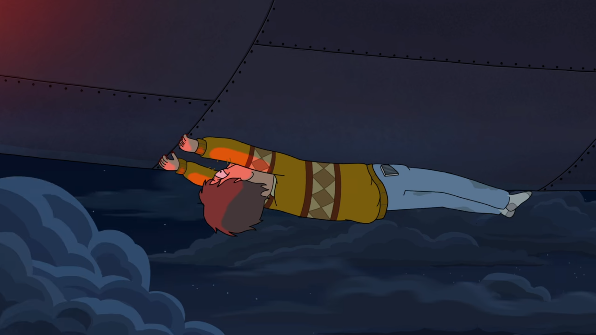 이렇게 죽을 수 없다는 생각에 나머지 한쪽 신발을 벗어던진 Jerry는 하늘로 날아올라 비행기에 달라붙습니다.