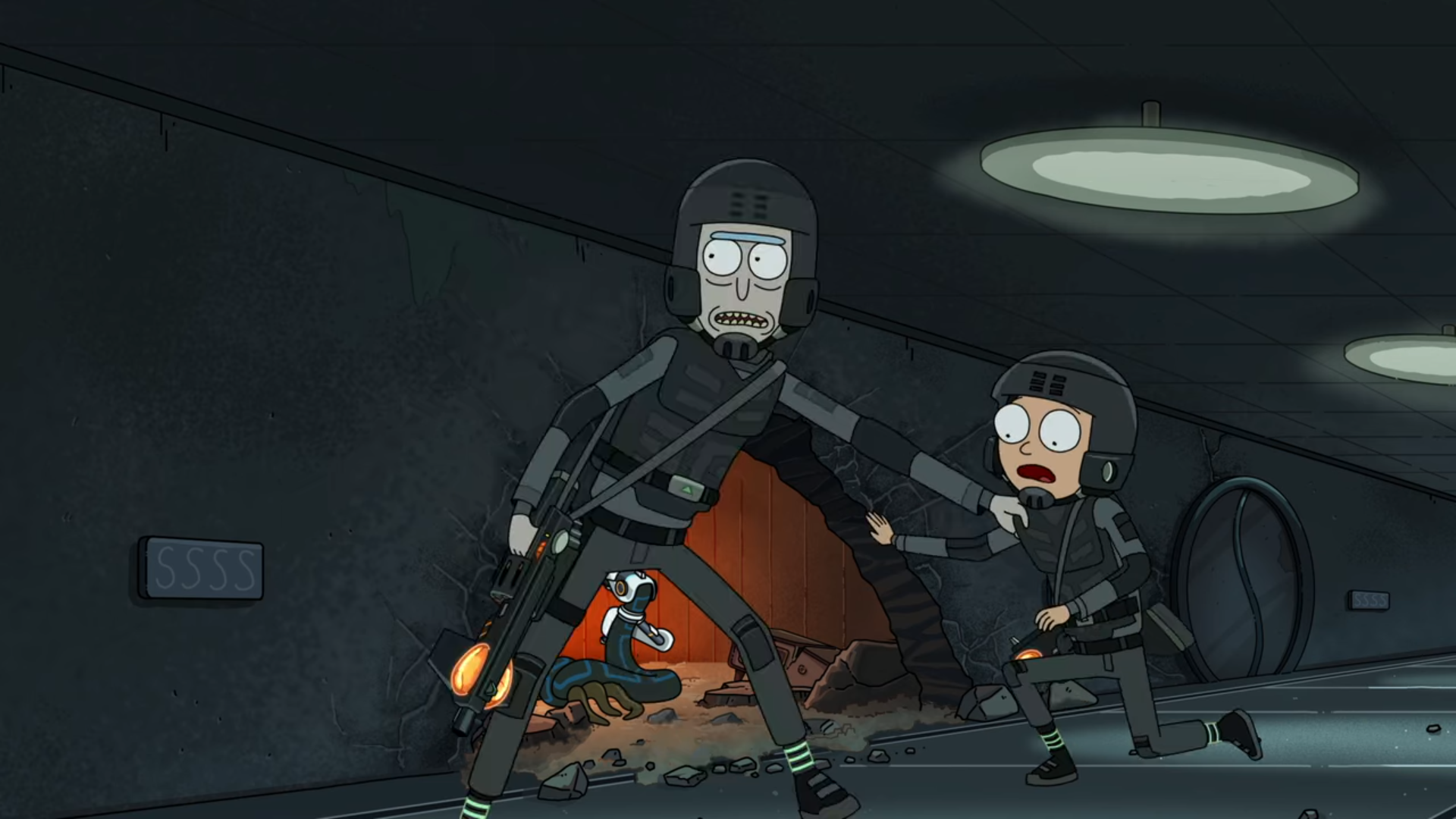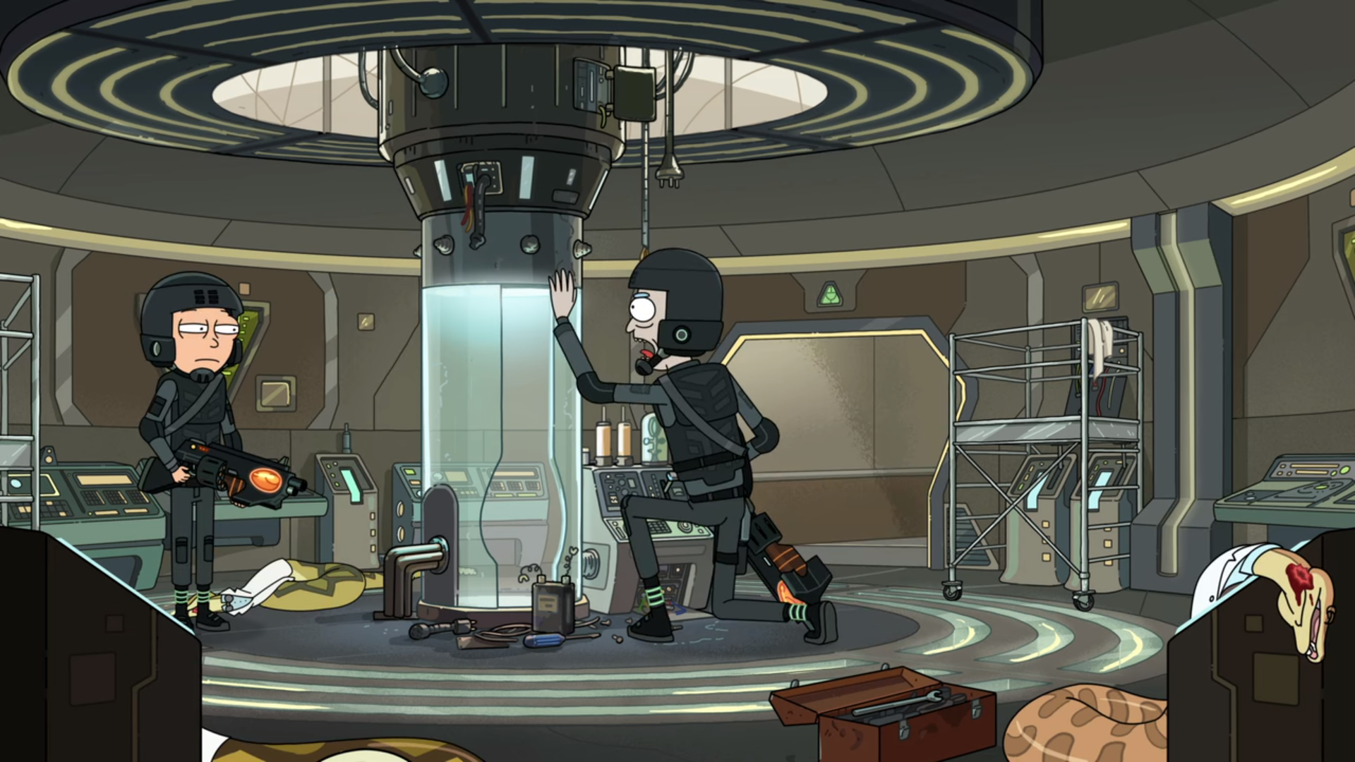 Rick과 Morty는 타임머신이 있는 곳까지 들어가지만 아직 타임머신이 만들어지지 않은 것을 보고 Rick이 황당해합니다. 잠시 생각을 해야겠다고 하는 Rick의 뒤로 다른 Rick과 Morty가 뱀 옷과 타임머신을 만드는 책, 타임머신을 들고 나타납니다. 그리고는 알아서 하라고 하고는 욕을 한바탕 하고는 떠나죠.