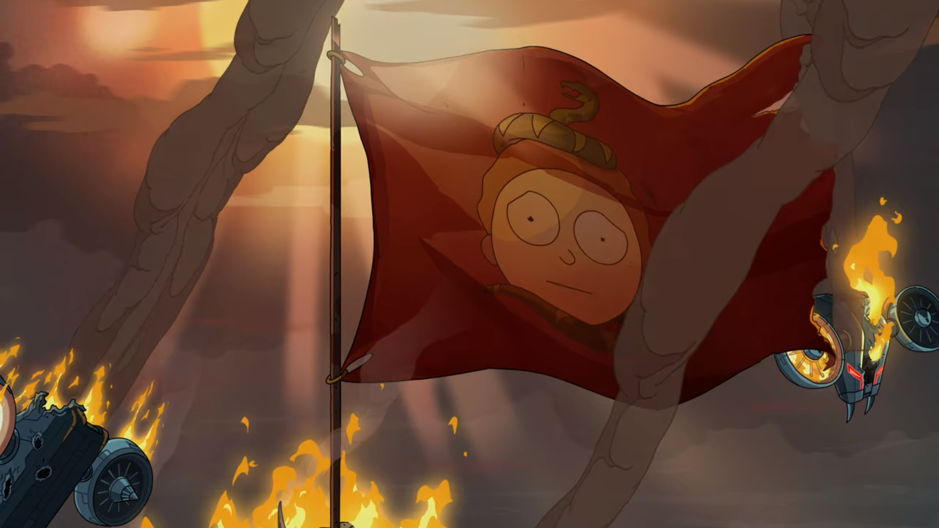 뱀 행성에서는 미래에서 기계 뱀들과 일반 뱀들이 싸우고 있습니다. 그리고 그 반란군의 깃발에 Morty의 얼굴이 그려져 있습니다.