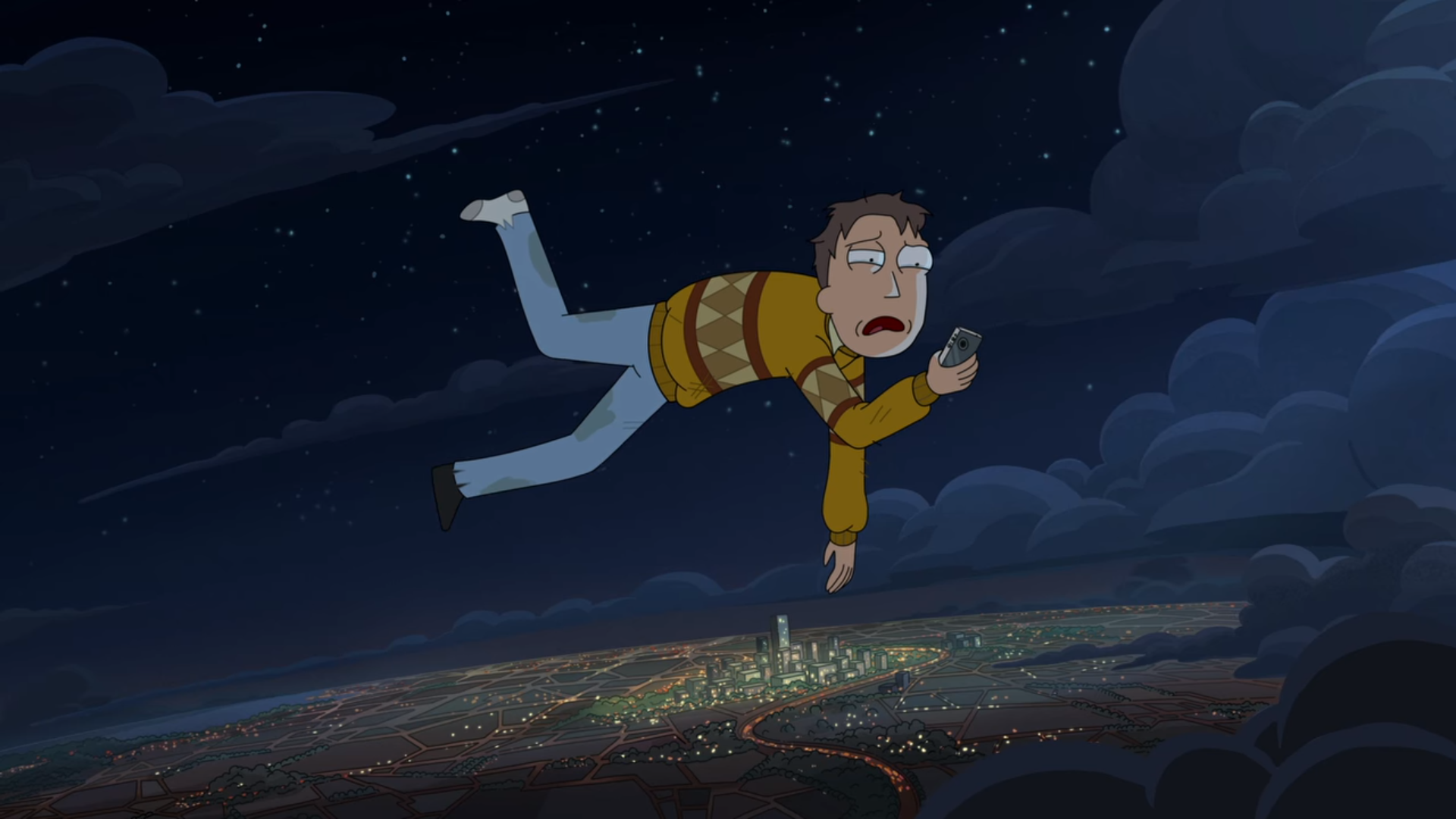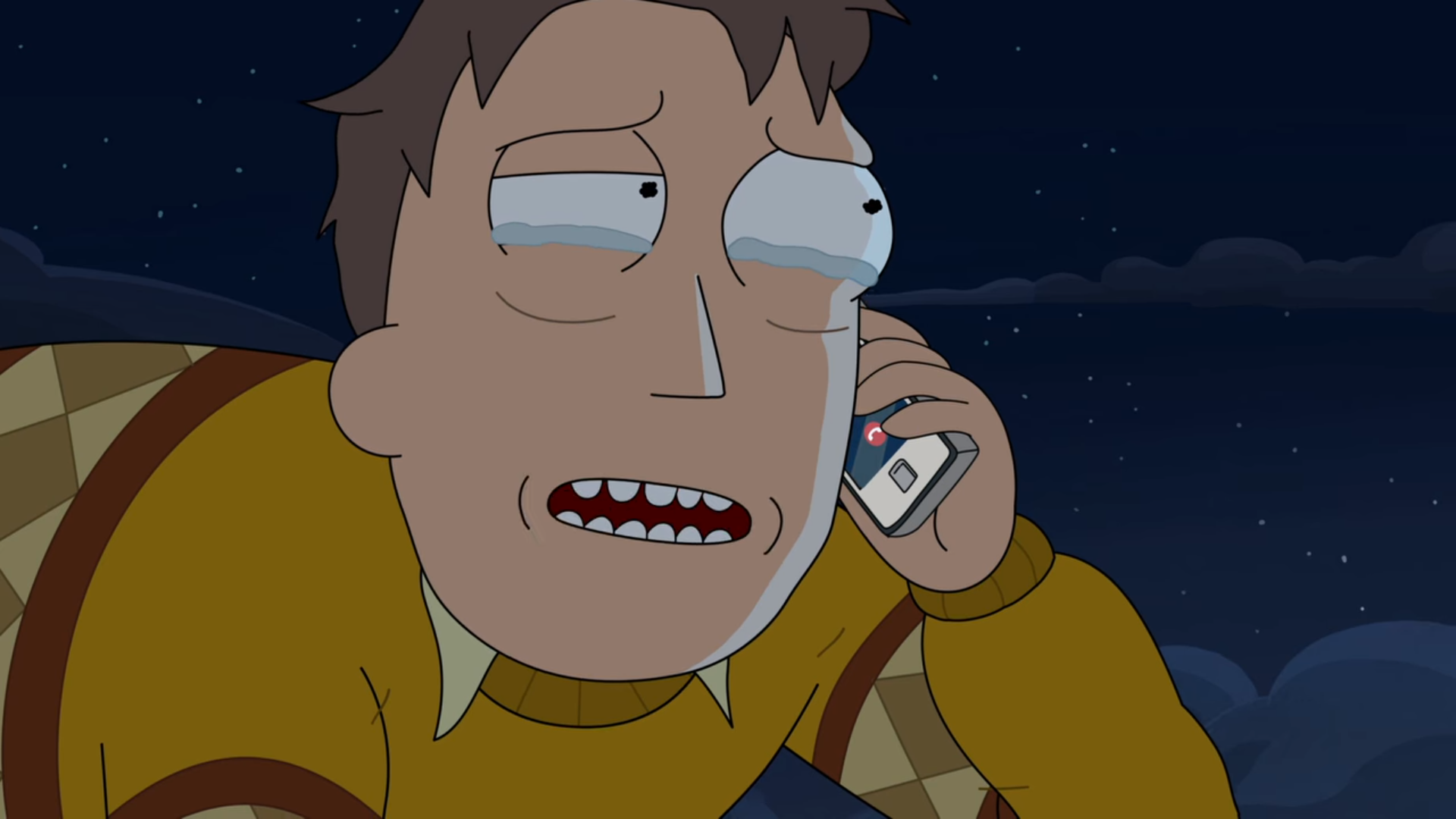 그동안 Jerry는 여전히 하늘을 떠돌고 있습니다. 이제 Rick의 레이저의 효과가 떨어지기까지 6분 남짓 남았습니다. 예전의 사진을 보면서 눈물을 흘리고 Jerry는 Beth에게 전화를 걸지만 Beth 전화기에는 Jerry의 전화번호가 없어서 보이스 메시지로 넘어갑니다.