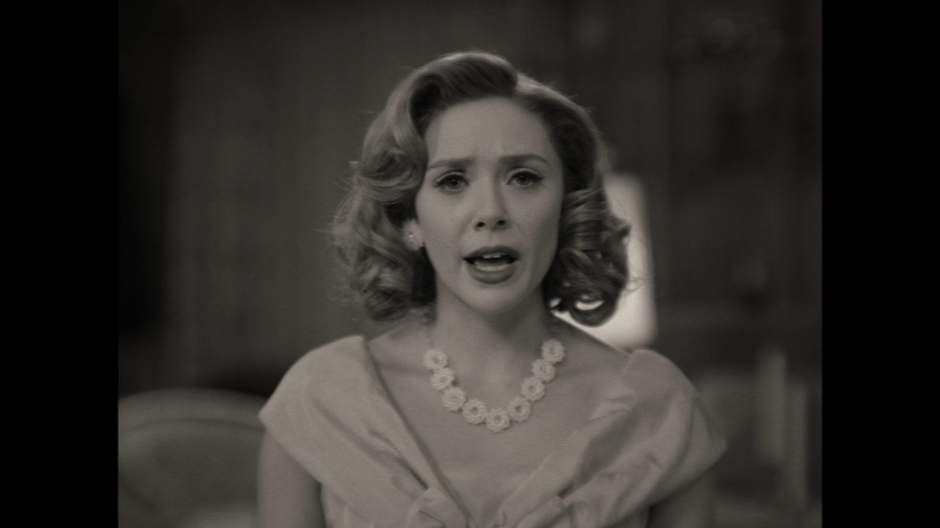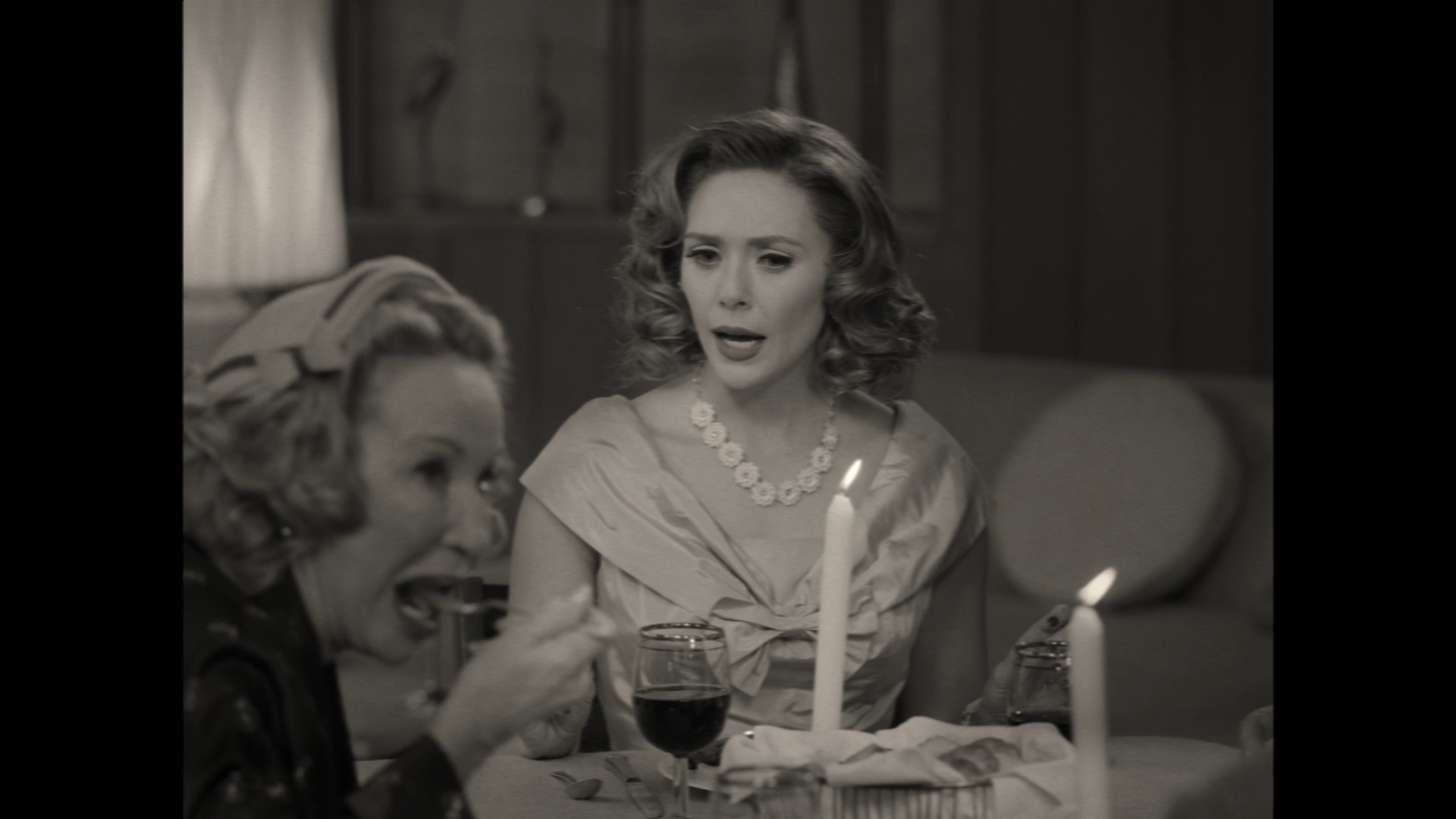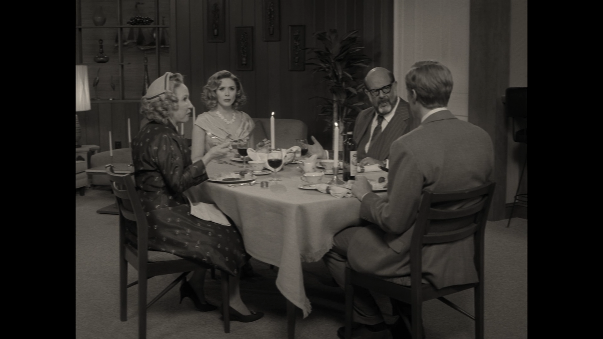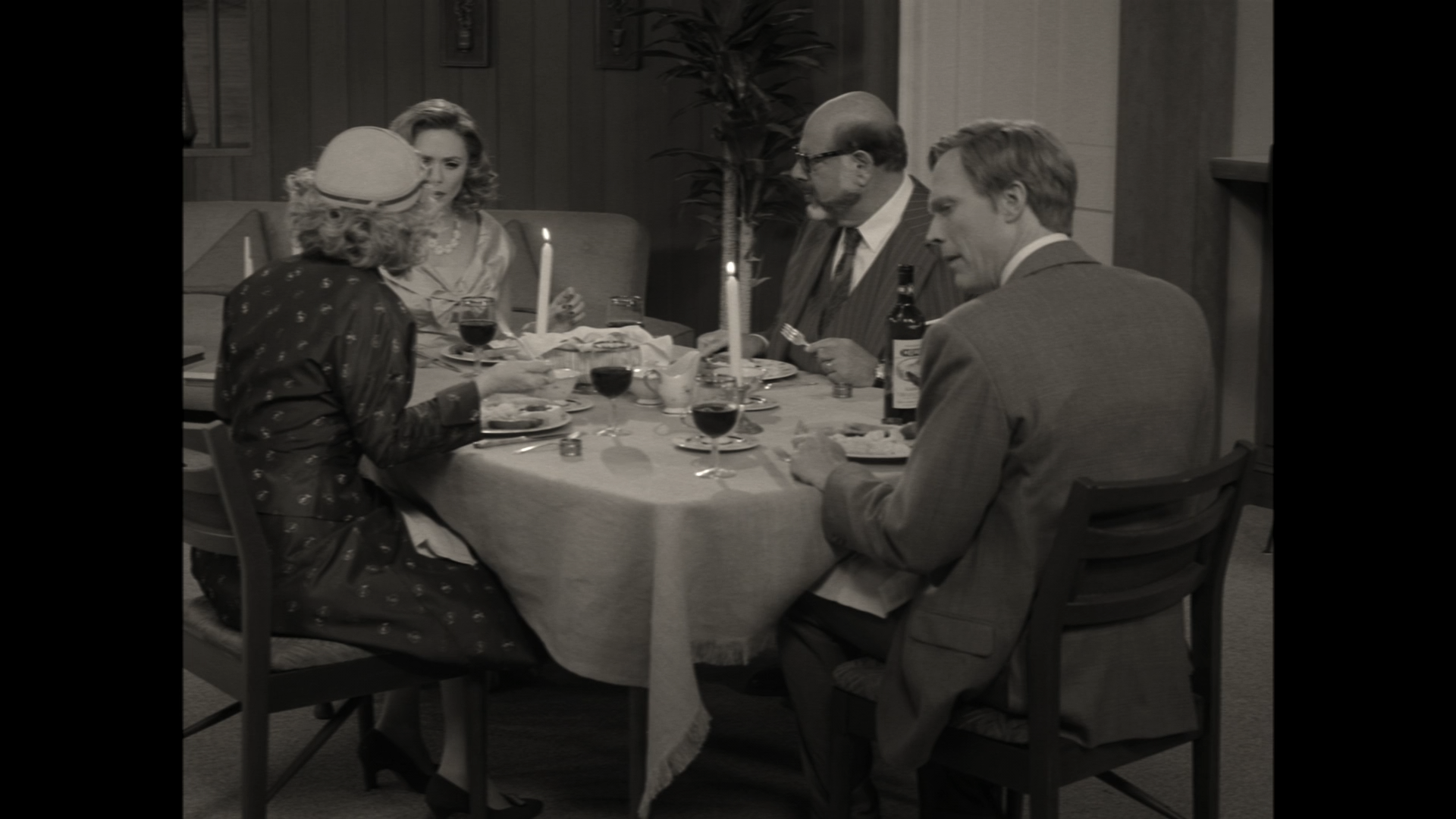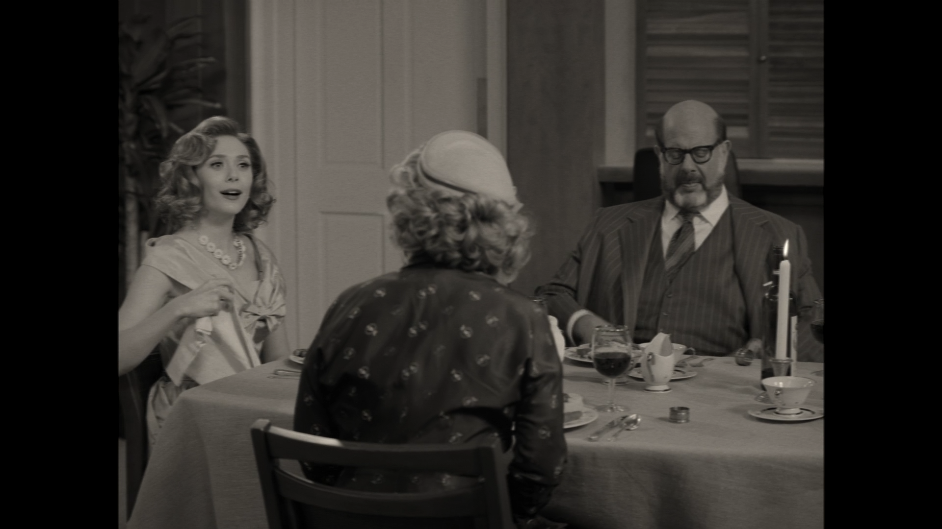 식탁에 앉자마자 Mrs. Hart는 어디서 왔는지, 어떻게 결혼했는지, 왜 아이는 없는지 속사포처럼 물어봅니다. 하지만 Wanda와 Vision은 이 질문들에 전혀 대답을 못하죠. Mr. Hart는 추궁하듯이 계속해서 물어봅니다.