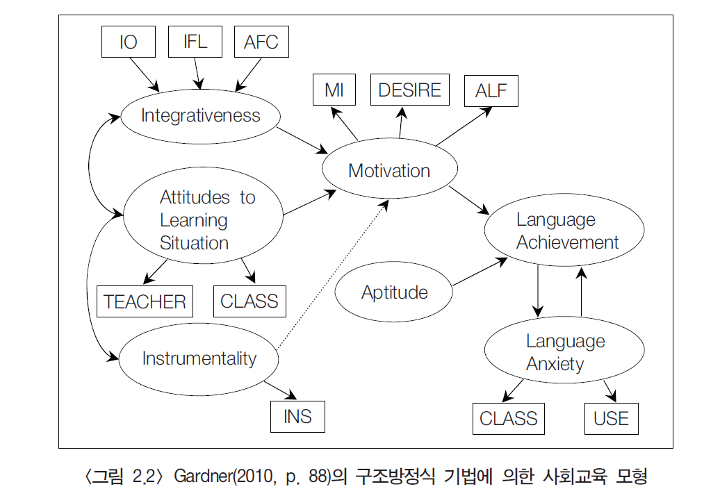 그리고 가장 두드러진 모형이 이 사회교육모형이고 동기 이론은 도구성, 통합성 동기를 말할 수 있을 것이다. 그러나 우리가 알고 있는 동기의 도구성, 통합성은 그 지향성(Orientation)을 의미하는 것이지 동기 자체를 설명하는 변인이 아니었다.
