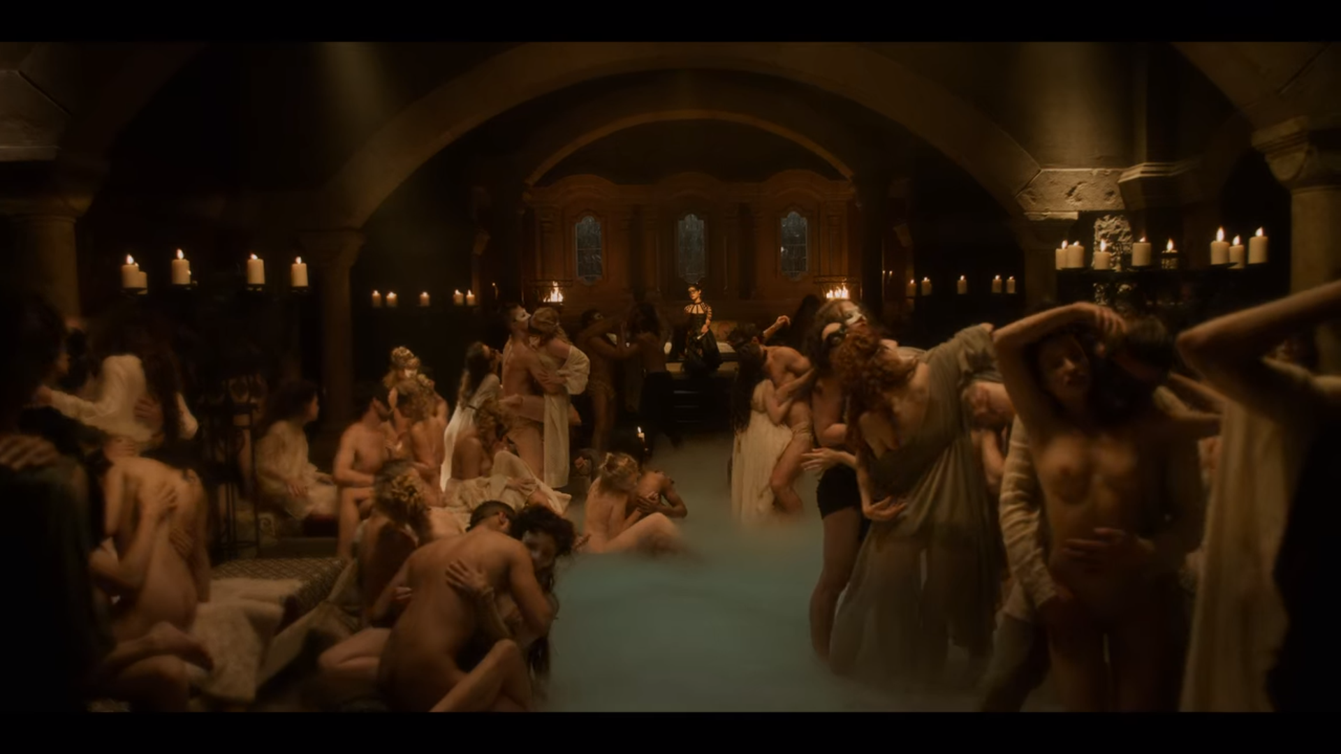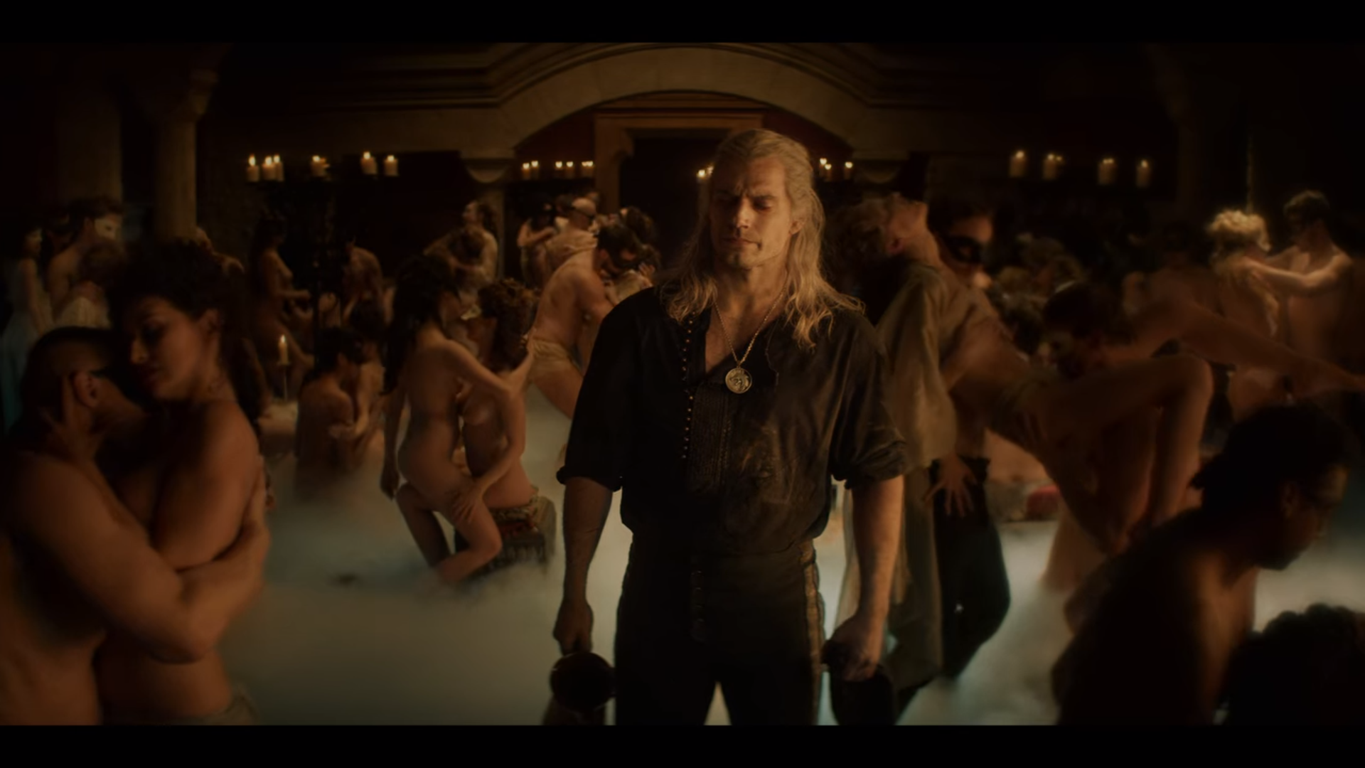 그렇게 들어간 Geralt와 Jaskier는 벌거벗고 있는 영주를 만납니다. 그러자 영주는 마법사가 사과주스를 가지고 오라고 했다고 하죠. 둘은 성안의 홀로 들어섭니다. 그곳에서는 사람들이 마법에 취해 난교를 벌이고 있습니다.