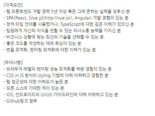 개발자와 디자이너 모두 포트폴리오를 제출하게끔 되어있으니 포트폴리오를 통해 그간 요구하는 자격요건이나 우대사항에 해당하는 업무를 진행해본 적이 있는지 알 수 있을 것이다. 이를 위해 채용 과제도 존재하지 않을까 하는 느낌이 든다.