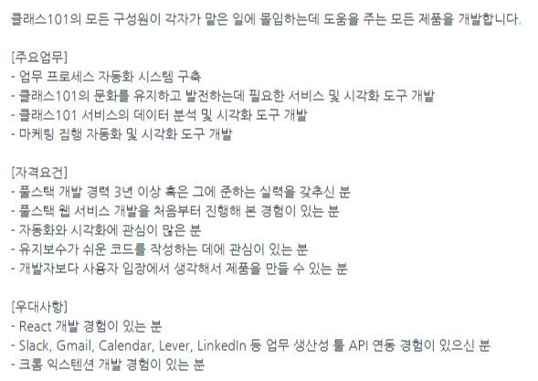 만약 클래스101와 유사하게 온라인 교육/강의 베이스의 제품이 출시된다고 할 때 필요한 개발자와 디자이너는 아마도 지금 채용공고에 올라가 있는 내용과 별반 다르지 않을 것이다.