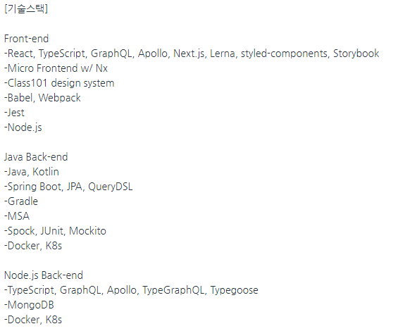 조금 살펴보면 프론트의 경우에는 Javascript/Typescript를 사용하고 React라는 라이브러리를 사용하는 듯하고, 백엔드 같은 경우에는 Java를 언어로 사용하고 Spirng을 프레임워크로 사용하는 듯하다. 조금 특이한 것은 백엔드의 경우 Java/ Spring으로 전환이라고 되어있으니 기존의 백엔드는 다른 프레임워크를 사용하고 있었을지도 모르겠다. (결국... 약간의 용어를 둘 다 알고 있어야 PM으로써 이 개발자들과 이야기를 할 수 있다는 말이나 진배없음)