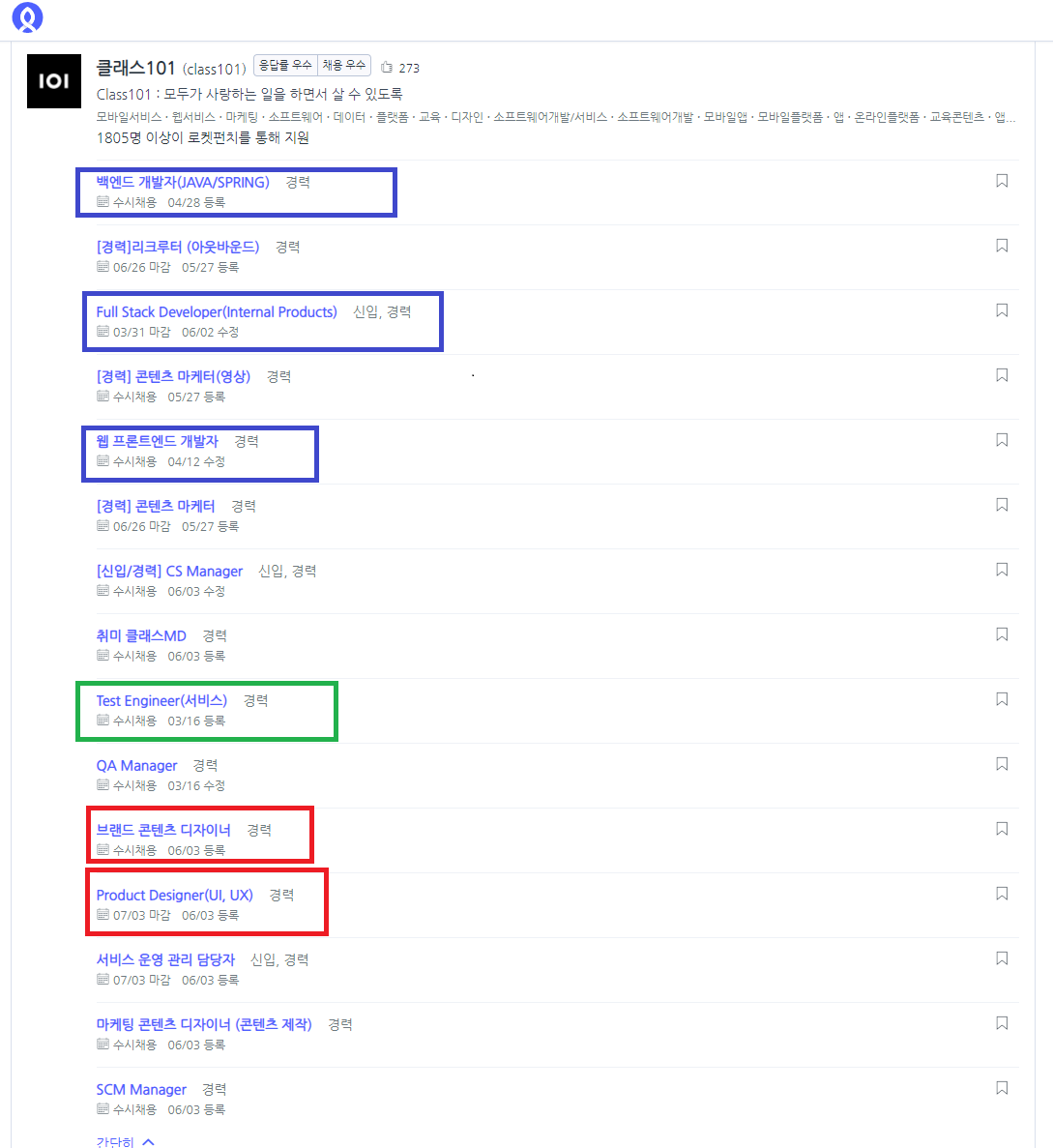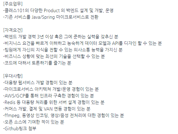 내가 가장 자신 있는 도메인(Domain) 영역은 교육이다. 교육이나 강의 관련되어서 현재 채용공고가 올라간 회사들을 찾아보니 클래스 101, 패스트캠퍼스 등이 보인다. 그중 로켓펀치에 등록된 클래스101의 채용 공고에는 개발자 직군으로 백엔드 개발자 (JAVA/SPRING), Full Stack Developer, 웹 프론트엔드 개발자를 뽑고 있다. 채용 목록에 Test Engineer도 있지만 회사에 따라 Test Engineer를 개발자로 보기도 하고 제품팀 소속으로 보기도 하기 때문에 우선은 개발 직군에서 제외하고 보도록 하겠다.