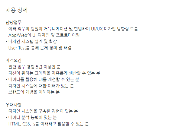 담당 업무의 경우에는 디자인 방향성 도출, UI 프로토타이핑, user test를 통해 문제정의 및 해결이란 걸 봤을 고객의 행동을 보고 분석하여 UI, UX에 반영/개선할 수 있는 사람을 원하는 것 같다.