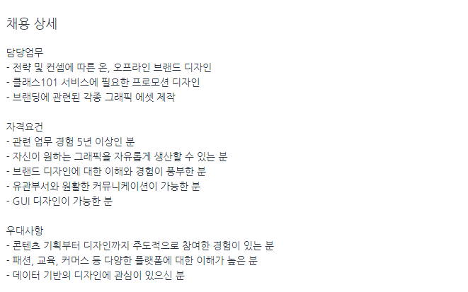 잘 살펴보면 전체적으로 디자이너의 경우에는 우대사항으로 데이터 분석 기술이 있고, 어떤 기획에 관련된 부분도 있다. 클래스101에서는 디자이너의 역량으로 이런 것을 더 높게 쳐주는 것을 알 수 있었다.