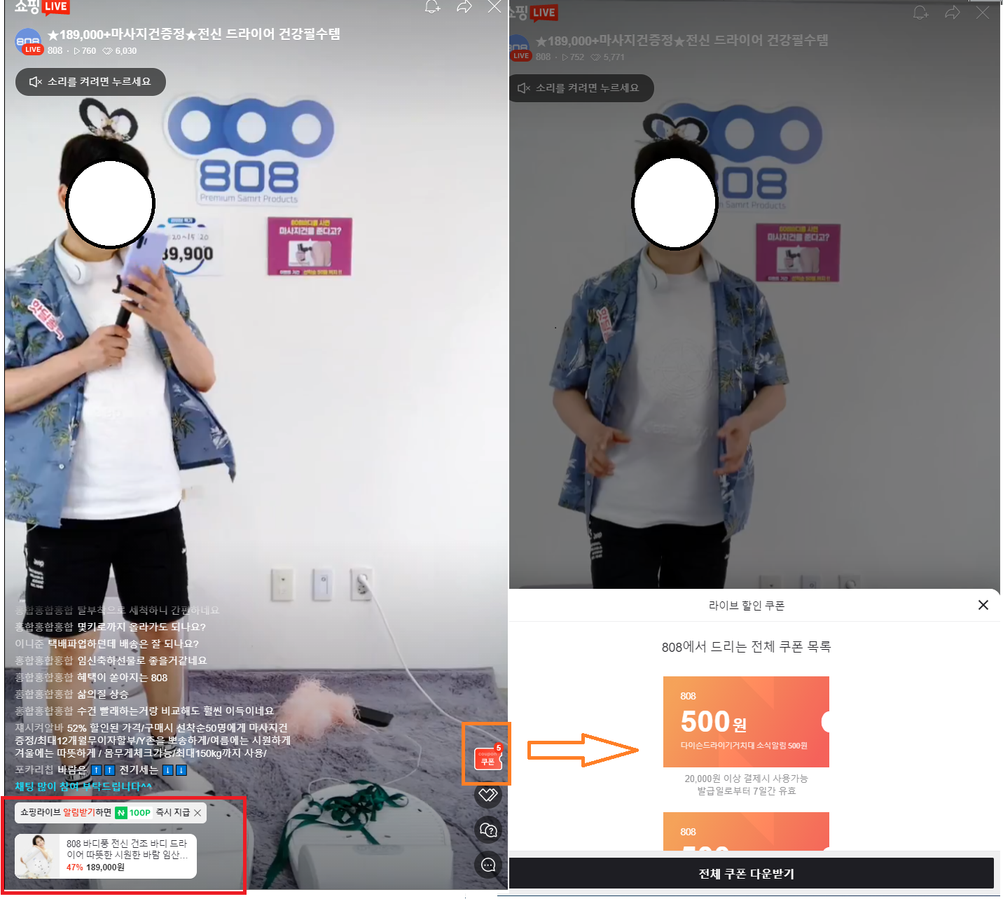 라이브 판매 중인 제품들의 구매 링크를 같은 화면에 바로 노출시키며 구매 유도를 일으키고 라이브 쇼핑 중 판매되고 있는 제품에 대한 특별 쿠폰을 바로 제시함으로 UI/UX적인 측면에서 구매자들의 즉각적인 액션(구매)을 유도하고 있는 것을 볼 수 있다.