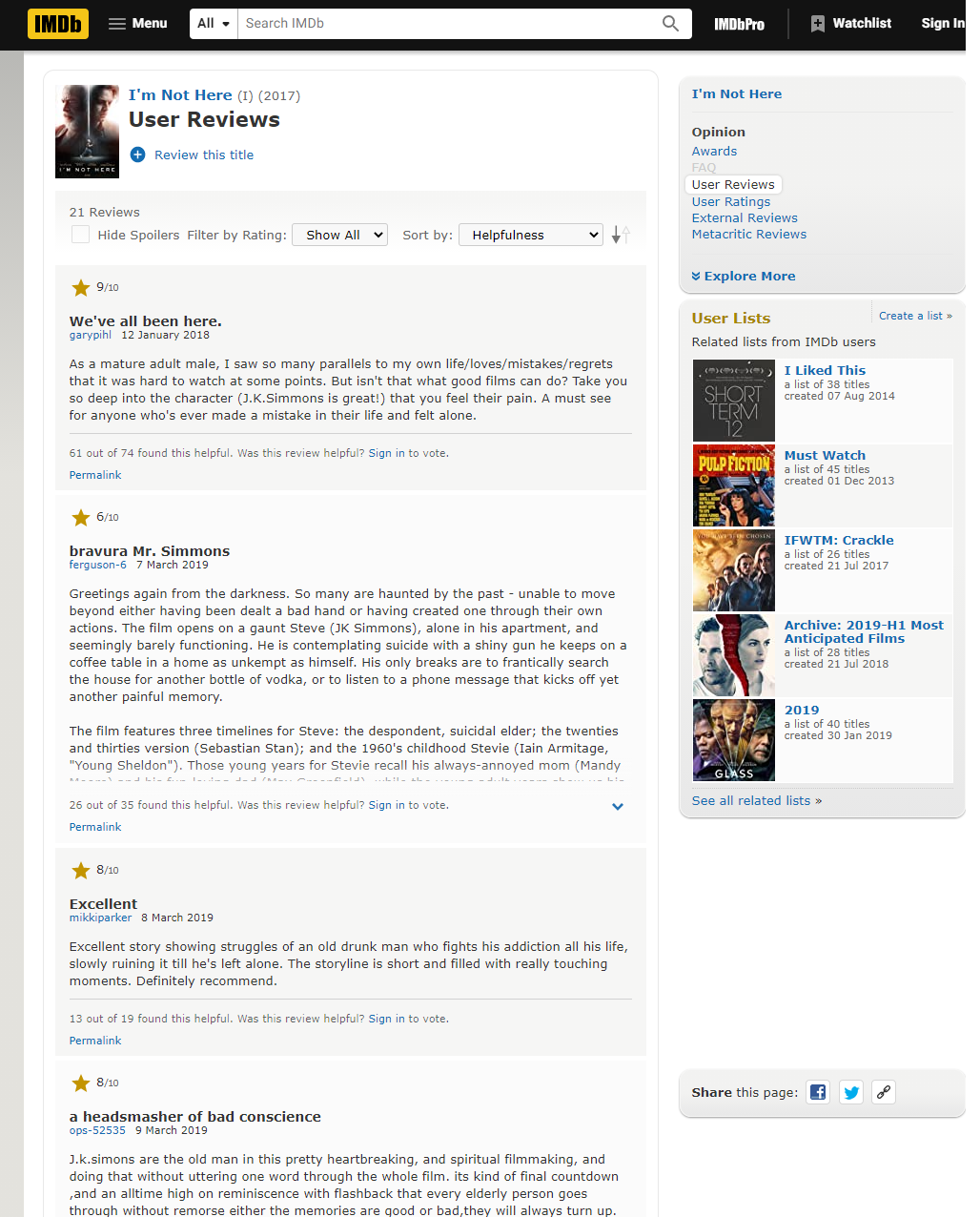 예를 들어 왓챠(Watcha)에 아임 낫 히어 (I'm not here)라는 영화가 올라왔다. 내가 좋아하는 배우 중 하나인 J.K. Simmons와 Sebastian Stan이 나온다고 되어 있어서 우선 호기심과 기대감이 있었다. 하지만 왓챠 자체로 내게 알려준 내 예상 점수가 5점 만점에 2.6점인 것으로 보아 우선 생각보다 나에게 맞지 않는 작품이라는 생각이 들었고, 감독 또한 내가 아는 사람이 아니기에 좀 더 정보를 검색해야 했다.