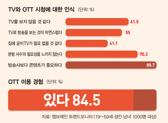 또한 이 시청자들의 TV와 OTT의 시청에 대한 인식을 알아보면 "TV를 보지 않을 것 같다"라는 사람이 1,000명의 대상자 중에 61.5%에 다다르는 것으로 보이고, "집에서 굳이 TV가 필요 없을 것 같다"는 사람도 41.1%로 꽤나 높은 비중을 차지하고 있다는 것을 알 수 있다.