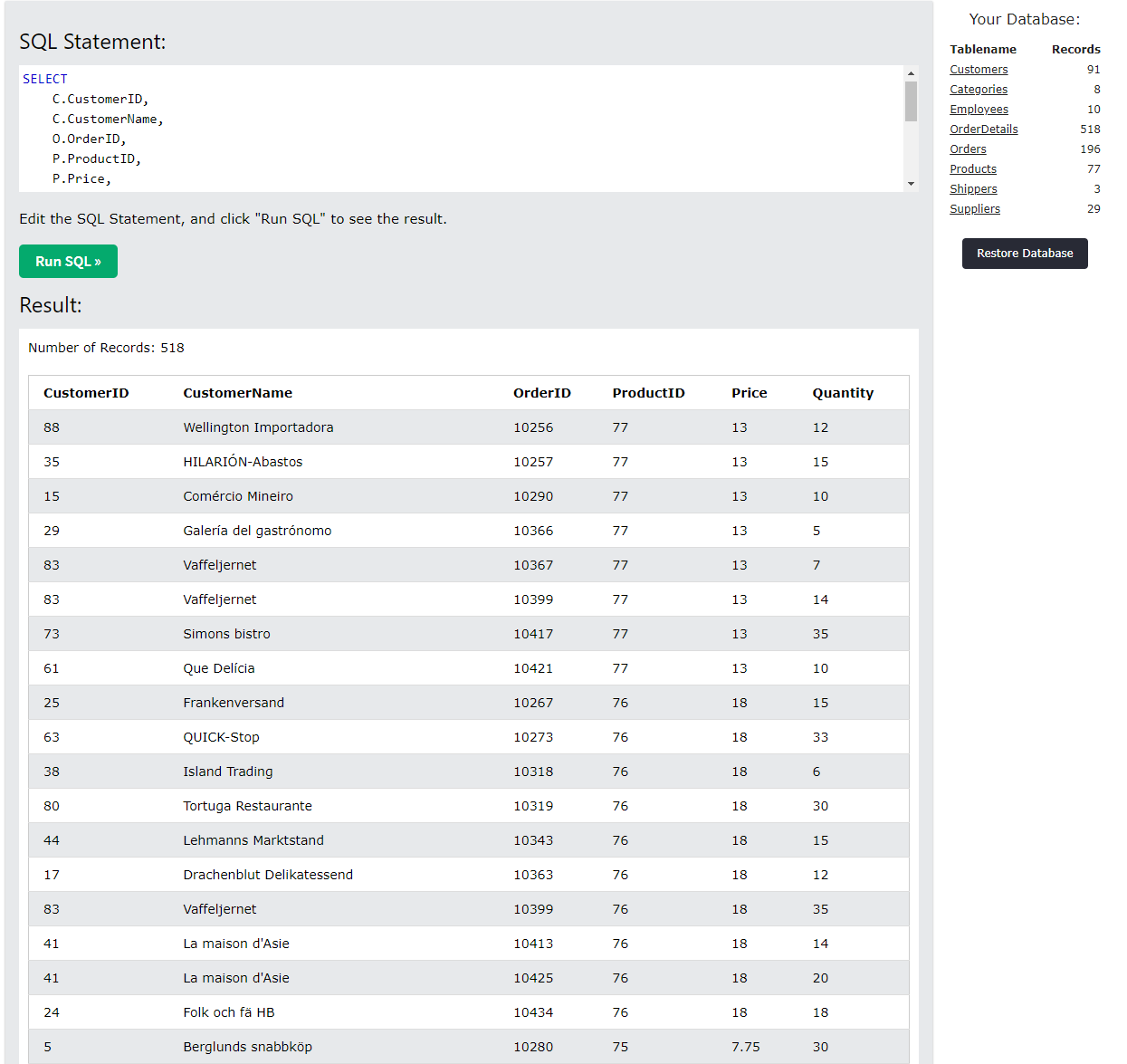 이제 CustomerID라는 Primary Key를 가진 테이블이 하나 만들어졌다. 이 테이블의 구성 요소로는 CustomerName, ProductID, OrderID, Quantity가 있다. 그럼 이제 기존 DB에 저장되어 있는 Customers 테이블의 CustomerID, CustomerName와 OrderDetails의 ProductID, OrderID, Quantity를 가져와서 새로운 테이블에 덧붙여 보도록 하자.