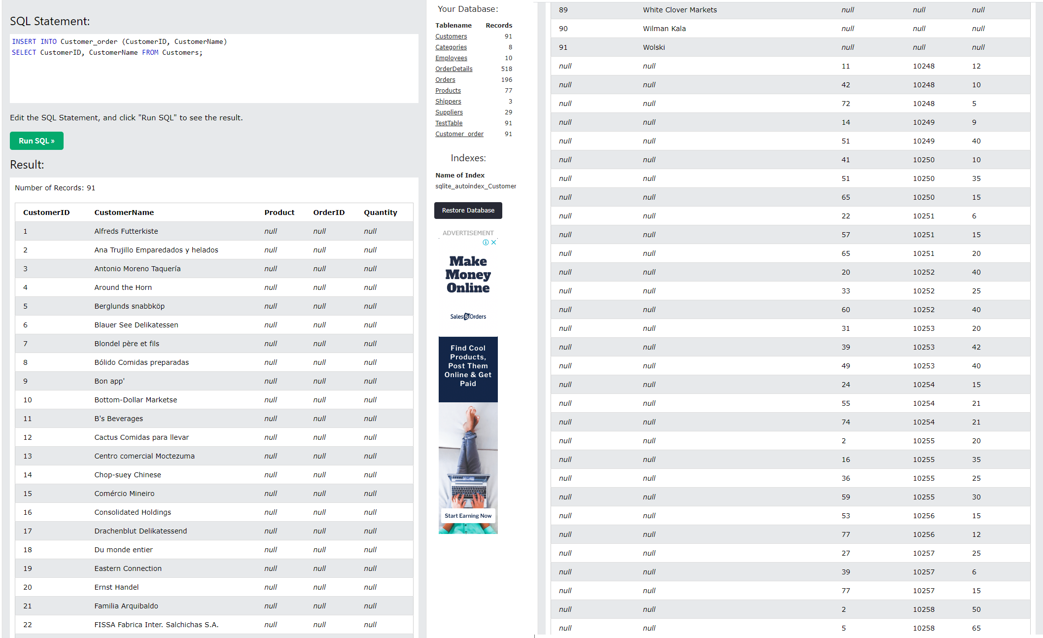 그렇다면 가장 먼저 할 일은 DB에 새로운 Table을 형성하는 것이다. 이를 실행하는 방법은 크게 2가지 방법이 있을 것이다. DB 내 다중 테이블 데이터를 뽑는 방법이 있고, 또 다른 하나는 새로운 테이블을 먼저 생성하고 각 필드에 해당하는 값들을 하나씩 배치하는 방법이 있을 것이다. 예시로 사용했던 w3school는 다중 테이블을 데이터로 불러오는 것이 불가능한 한계가 있어 조금 번거롭더라도 Customer_order라는 테이블을 새로 생성해보도록 하겠다.