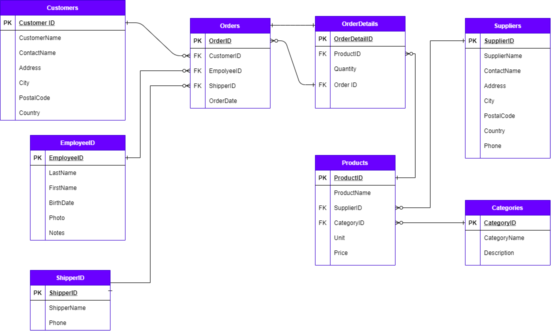 물론 실제 데이터가 있으면 정말 좋겠지만 일단은 w3school SQL에 예시를 이용해 역으로 DB 스키마를 만들어 보았다. 기본적으로 이 관계를 나타낼 때 여러 가지 선이 사용이 되는데 '일반적으로 공부를 해보면 이게 무슨 뜻이지?' 하는 생각이 들곤 한다. 그러나 이렇게 스키마를 정리하다 보니 이 관계가 어느 정도 눈에 익게 되었다.