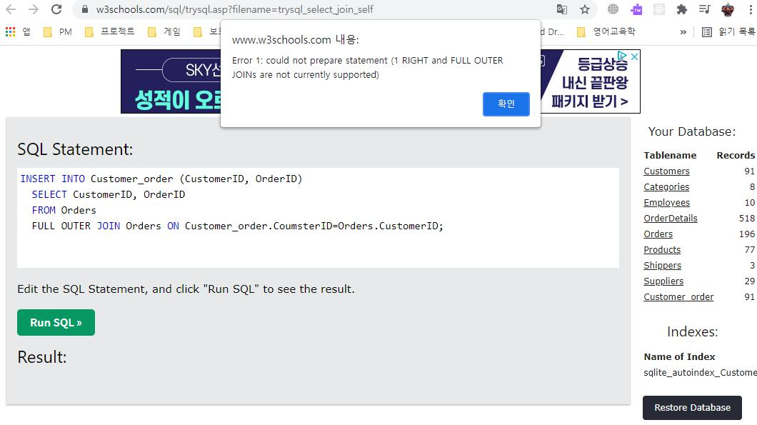 이 부분을 해결하기 위해서 또 다른 방법으로 FULL JOIN이란 기능을 써보려 했지만 이것 역시 기준이 되는 Primpary Key의 부재로 인해 불가능할 뿐만 아니라 w3school에서는 FULL JOIN 기능 지원을 하지 않는다고 한다.