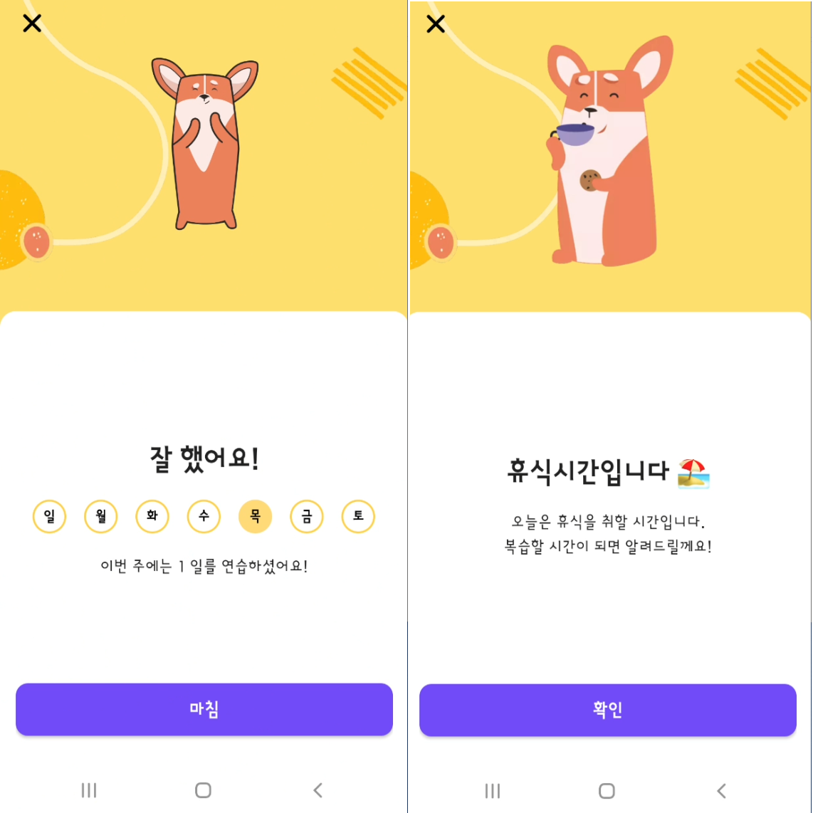 그럼에도 불구하고 이러한 디자인이 귀엽고 아기자기하다는 것이 이 앱의 사용성을 판단하는데 작용할 수 있다. 개인적으로 처음에 이 서비스를 분석하기 위해 서비스를 경험 전에는 디자인이 좋다는 이유만으로 잠시 서비스 자체가 좋다, 나쁘다를 확실히 판단하지 못했다. 물론 학습 앱의 특성상 목적이 뚜렷하고 이 목적을 이루지 못한다고 하면 이탈이 아주 손쉽게 되는 경향성이 있지만 학습을 이어가는 사람들을 잡아주는(Retention)의 효과로는 적용할 수 있을 것이다.