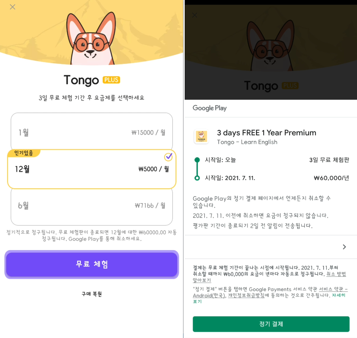 우선 Tongo의 유료 구독형 서비스를 비즈니스 모델(BM)로 채택하고 있다. 가격이 마냥 싸지 않다는 느낌을 주는데, 1달에 15,000원으로 12개월을 구독한다면 월 5,000원으로 비교적 저렴하다고 할 수 있다. 3일의 무료 체험판을 두어 기본적으로 경험을 할 수 있게는 해 놓지만 그 외에는 서비스를 깊이 체험해 볼 수 없어서 약간 아쉽기도 하다.