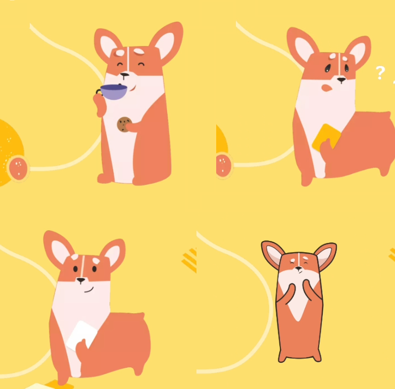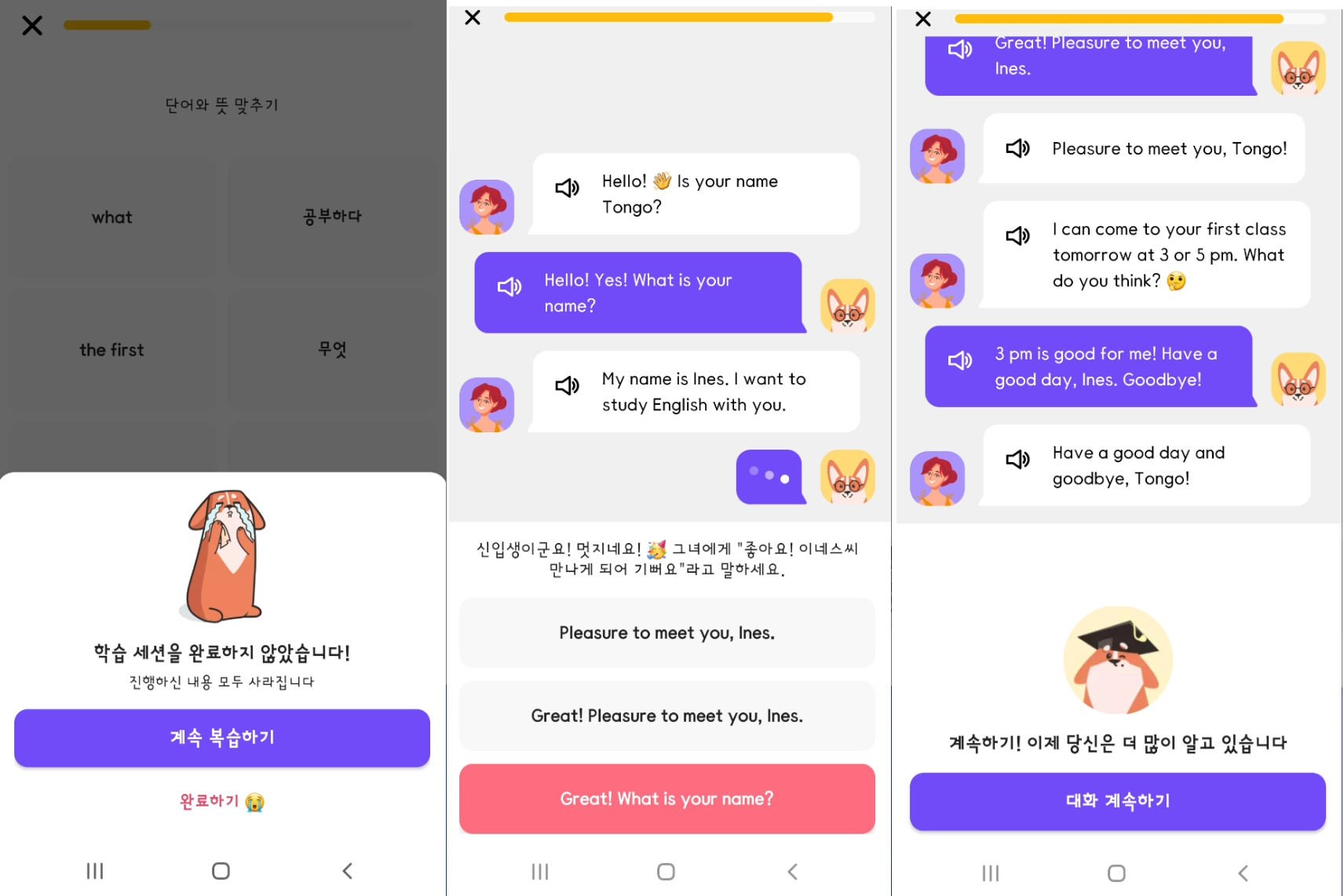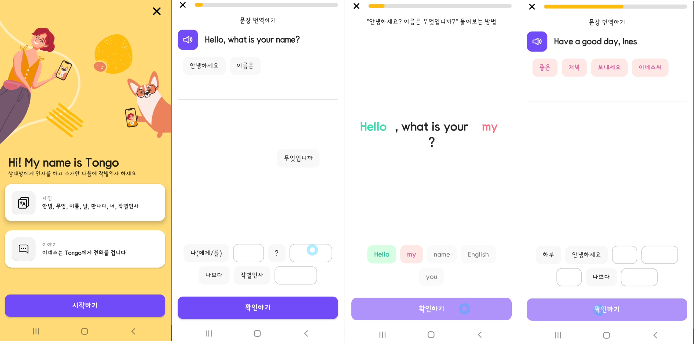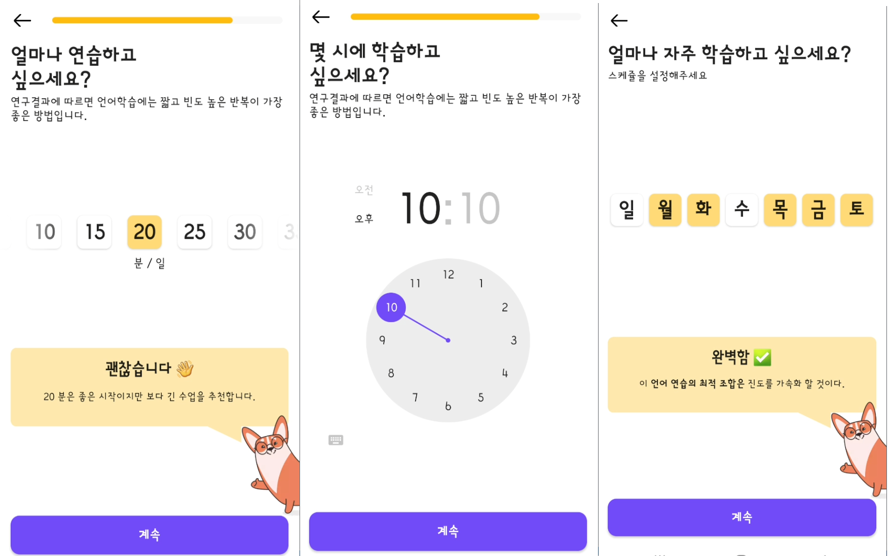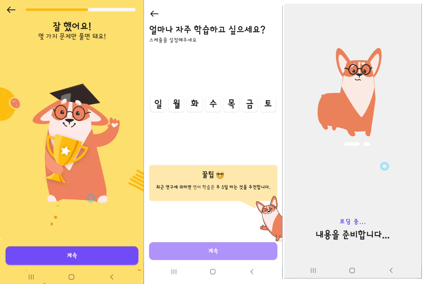서비스의 전반에서 보면 학습을 제외하고 가장 눈에 띄는 것은 이 Tongo의 메인 캐릭터인 웰시코기 강아지이다.