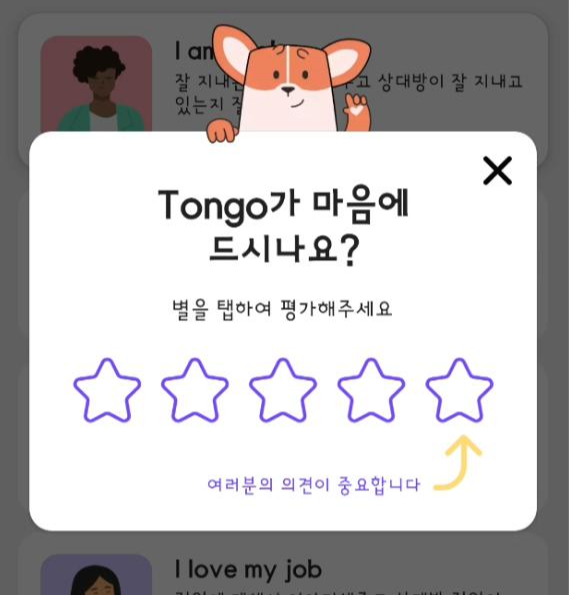 또 다른 시점은 앱을 재방문했을 때이다. 다시 앱을 사용하러 왔거나 혹은 아이디를 삭제하러 온 경우이기 때문에 역시 좋은 경험이거나 반대의 경험일 것이다. 이때에 또 Tongo는 별점을 물어봐서 Feedback을 얻고 있는 중이다.