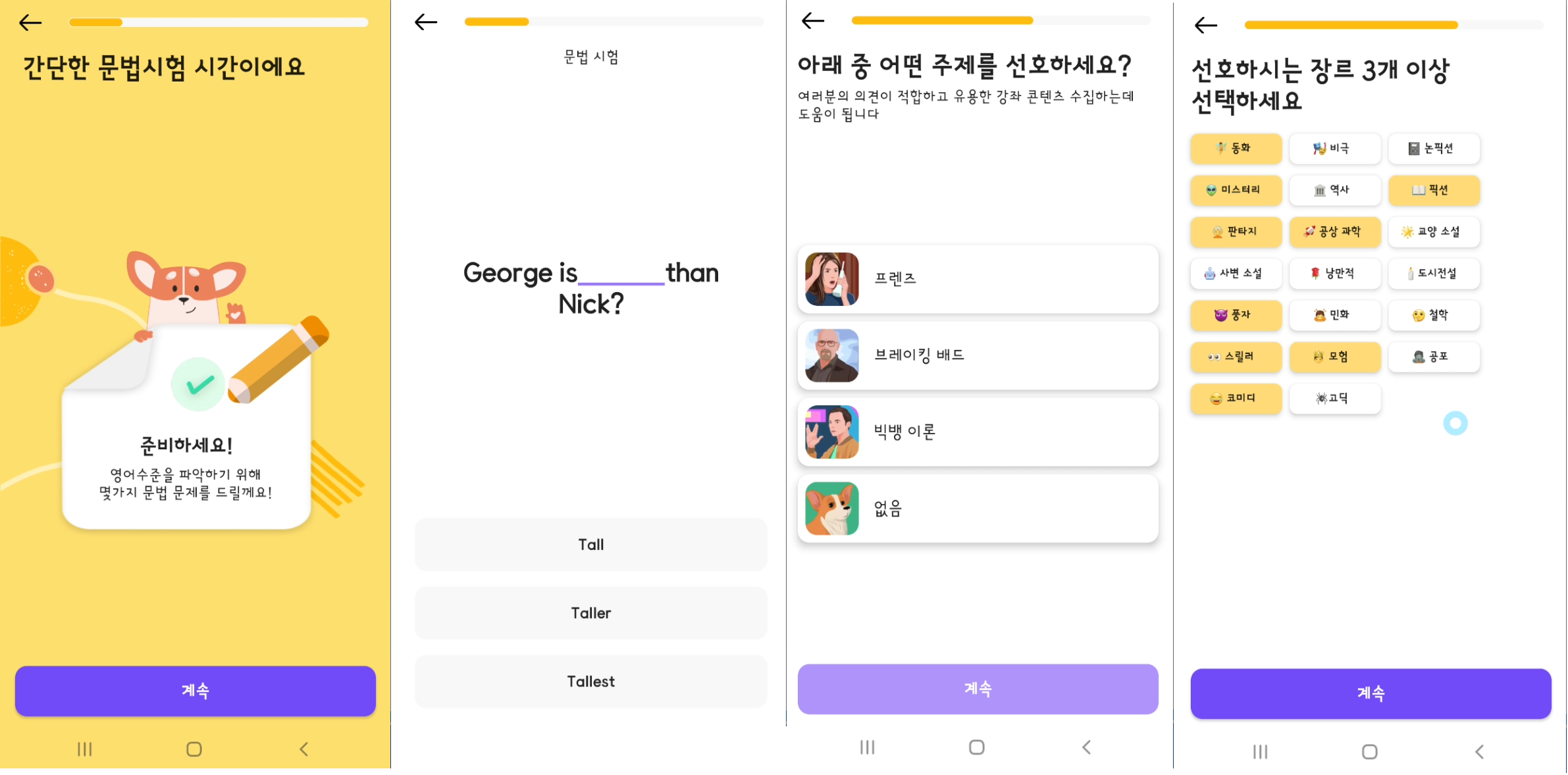 대부분 영어교육 서비스들은 학습자의 성향과 취향을 고려하여 개인화된 서비스를 주려고 노력하고 있다. 또한 서비스를 이용하는 고객들도 이런 서비스가 되기를 기대하고 앱을 설치하는 경우가 많다. Tongo에서는 자기 주도 학습이 더 주된 요소이기 때문에 영어를 공부하는 목적, 목표, 수준을 물어보고 간략한 레벨 테스트와 관심분야 설정을 통해 개인화를 끌어내려고 하고 있다.