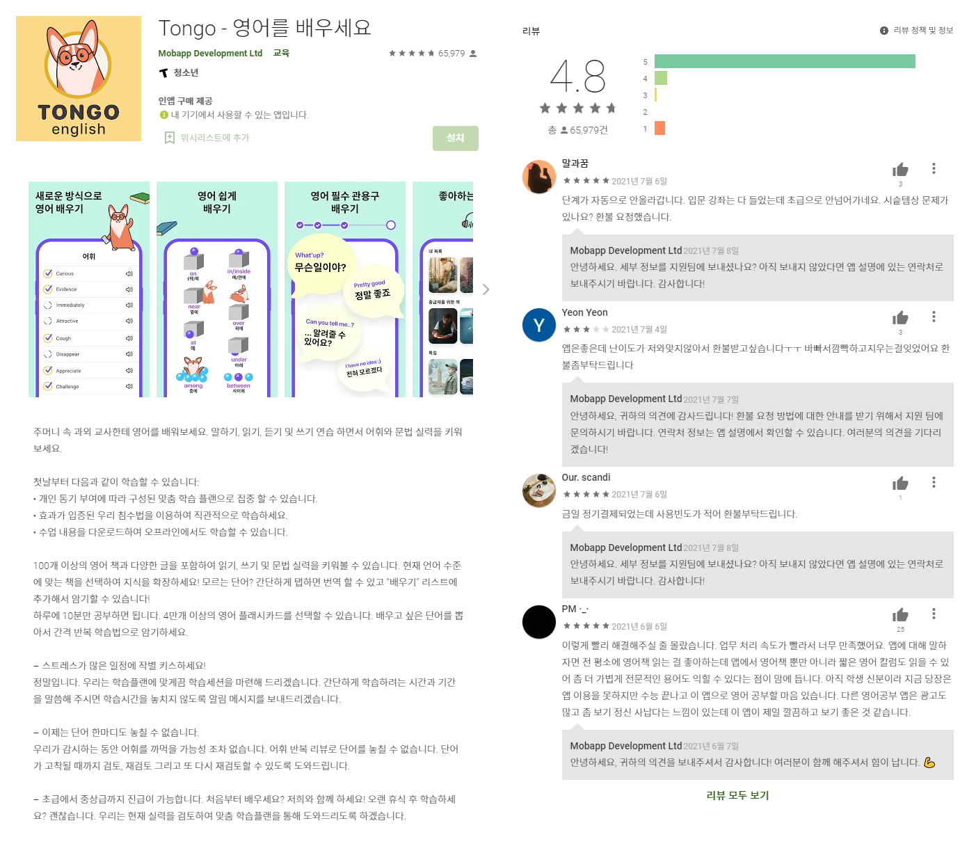 이 Tongo의 서비스를 자세히 뜯어보면 기존에 있는 영어학습 앱과 차별성을 찾아보기가 어렵다. 또한 위에서도 언급을 했지만 학습을 하는 것에 있어서 UI적으로도 아직 개선을 해야 할 여지가 많아 보인다. 실제로 앱스토어에 있는 평가들을 살펴보면 기능 문제가 꽤나 있는 것으로 보인다. (물론 가장 큰 문제는 양질의 컨텐츠의 부재이다.)