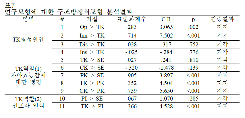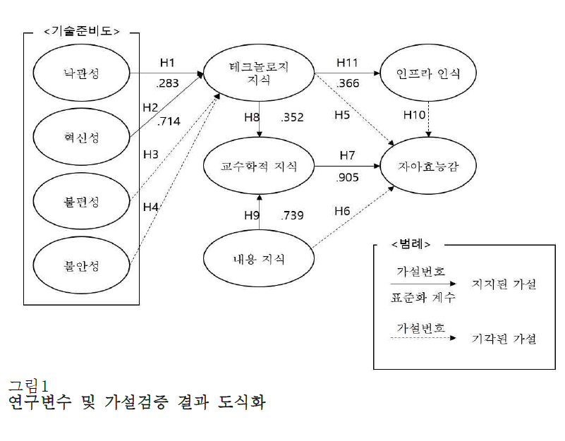 또한, 가설 8, 9에 대한 검증 결과를 통해 테크놀로지 지식은 그 자체가 직접적으로 자아효능감에 영향을 미치기보다는 교수학적 지식을 통해 간접적인 영향을 미치는 것으로 나타났다. (발췌 p128)