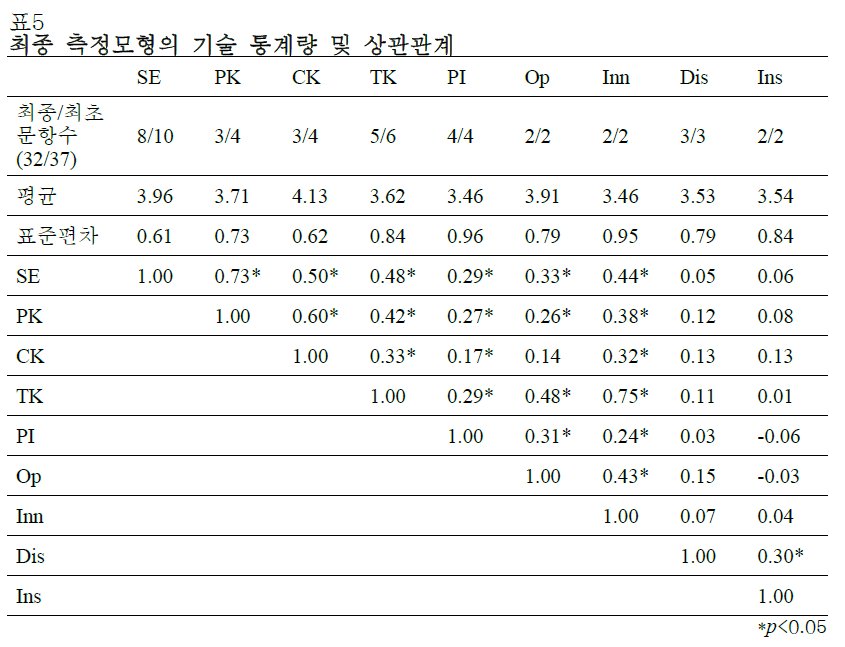 Factor loading이 0.5에 미달하는 4개 문항은 제거 (자아효능감 문항 3, 10번, 내용 지식 4번, 교수학적 지식 4번)