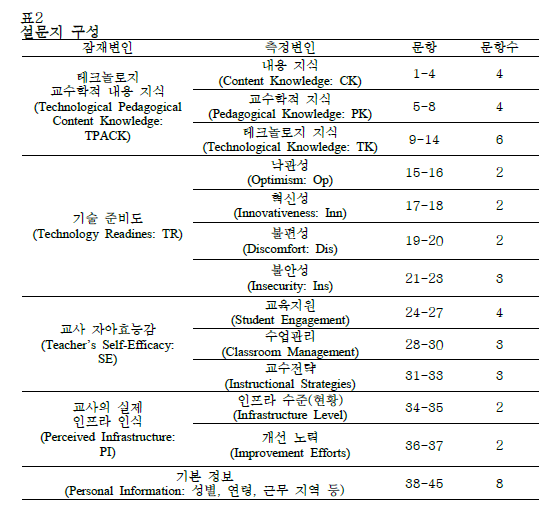 1) 온라인 원격수업 등 원활한 교수 활동을 추진하기 위해 필요한 테크놀로지 지식 (Technological Knowledge)을 정의하고, 그것이 어떻게 형성되는지 구성 요인들에 대해 설명함으로써 영어교사의 테크놀로지 지식의 증진 방안을 제안한다.
