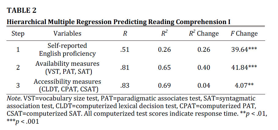 (2) Accessibility of word knowledge made a unique contribution to explaining reading comprehension, over and above self-reported English language proficiency and availability of word knowledge.
