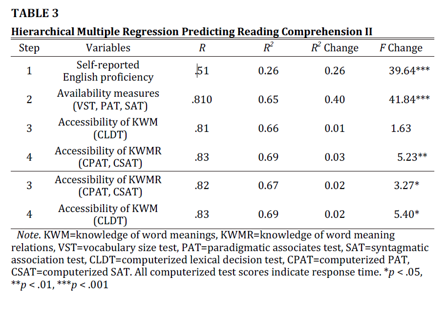 (3) Between accessibility of KWM and KWMR, accessibility of KWMR had a stronger predictive power in explaining reading comprehension when other effects were accounted for.