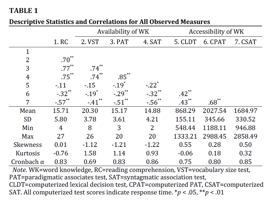 (1) Measures for accessibility of word knowledge were significantly associated with measures for availability of word knowledge and reading comprehension. However, accessibility of KWM (measured by CLDT) did not relate to availability of KWM (measured by VST) and reading comprehension.