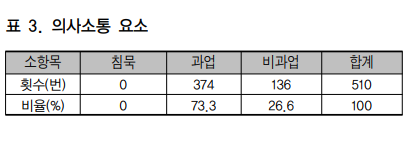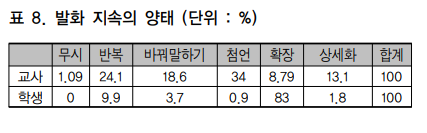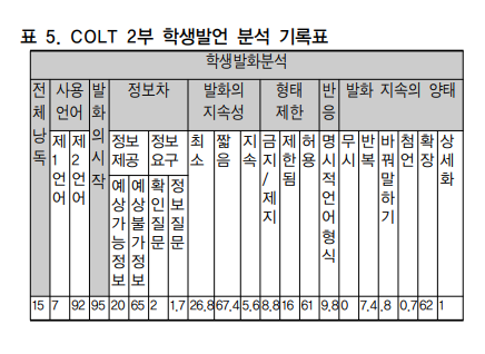 둘째, 교사와 학생의 정보차 발언과 발화 지속의 양 태를 분석하였을 때 의사소통 중심 수업임을 알 수 있다.