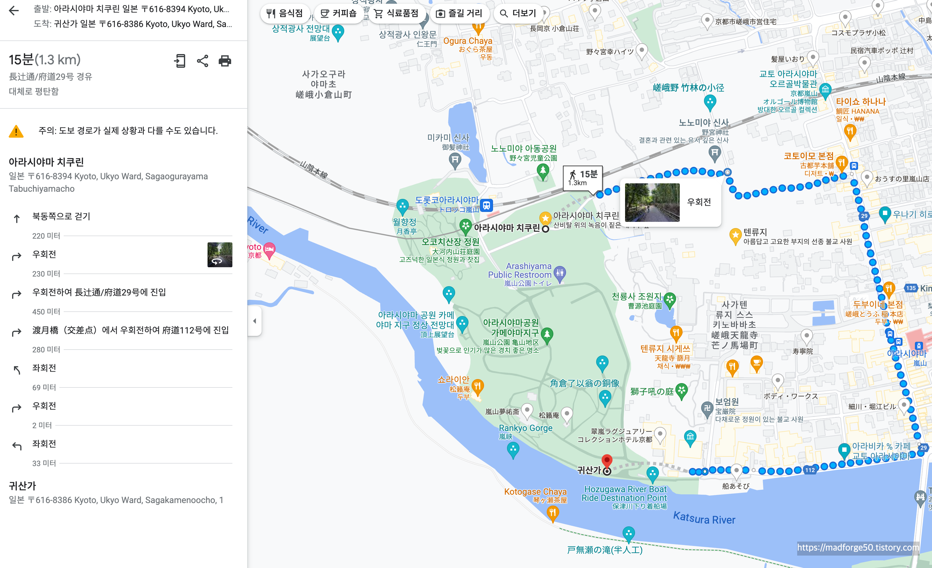 그래서 지도를 잘 살펴보니 아라시야마 공원을 가로지르는 루트가 있어서 그곳으로 가기로 했다. 다만 이렇게 가면 원래 사람들이 들어가는 루트의 반대로 진입하게 된다. 그 대신 상점가를 거치지 않고 공원의 숲을 보면서 대나무 숲을 볼 수가 있어서 자연경관을 좋아하면 이렇게 가는 걸 추천한다. (오른쪽 지도의 붉은색으로 표시한 길이다. 따라가다 보면 어렵지 않게 길을 찾을 수 있으니 괜찮다.)