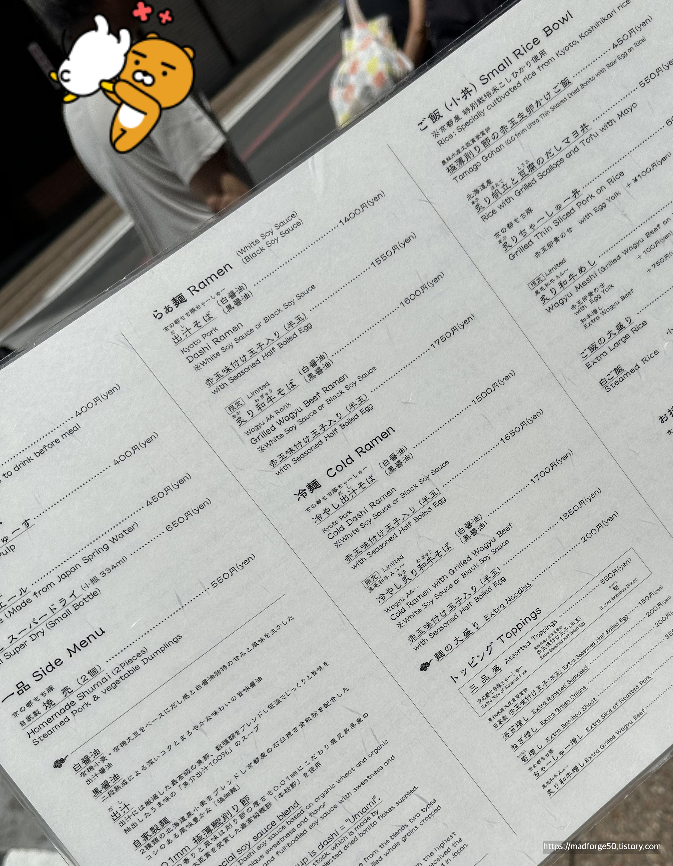정말 이번 여행은 햇볕과 더위와의 싸움이었던 것 같다. 그 때문에 기다리는 동안이 짧음에도 불구하고 체감상으로는 더 많은 시간을 기다린 느낌이다. 12:10분에 가서 라멘이 나오기까지 한 15분을 기다렸지만 체감으로는 30분은 족히 기다린 느낌이었다. 예약 시간에 맞춰 줄을 서서 기다리고 있으면 종업원이 메뉴를 가져다주고 주문을 받아 간다. (다만 밖에 기다리는 것뿐만 아니라 매장 안에도 줄이 있다.)