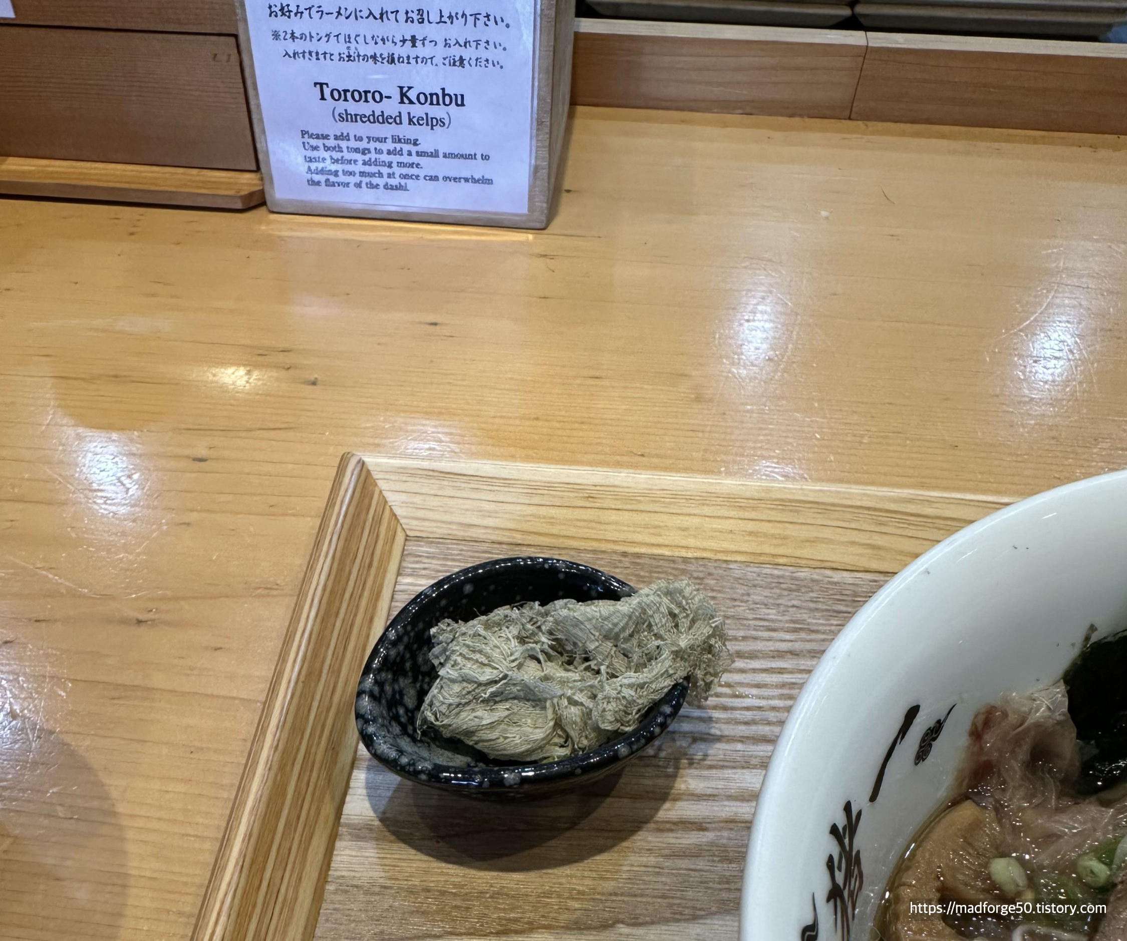 그냥 Tororo-Konbu를 해석해 보면 '마-다시마'라는 뜻이다. 집게로 이 다시마를 꺼내보니 실타래 같이 생긴 아주 얇은 다시마가 겹겹이 쌓여 있는데 한지 같은 질감이다. 하지만 이것을 라멘 국물에 풀면 마치 '콧물'처럼 변하는데 다시마 향이 강하게 나는 마를 푼 느낌이라고 할 수 있다. 개인적으로는 라멘에 변주를 줄 수 있어서 가끔 넣어서 먹었지만 아내는 식감이 너무 이상해서 먹기 싫다고 했다. 이 Tororo-Konbu는 호불호가 있을 토핑이긴 하다. 하지만 한 번쯤은 넣어서 먹는 것도 추천을 한다.