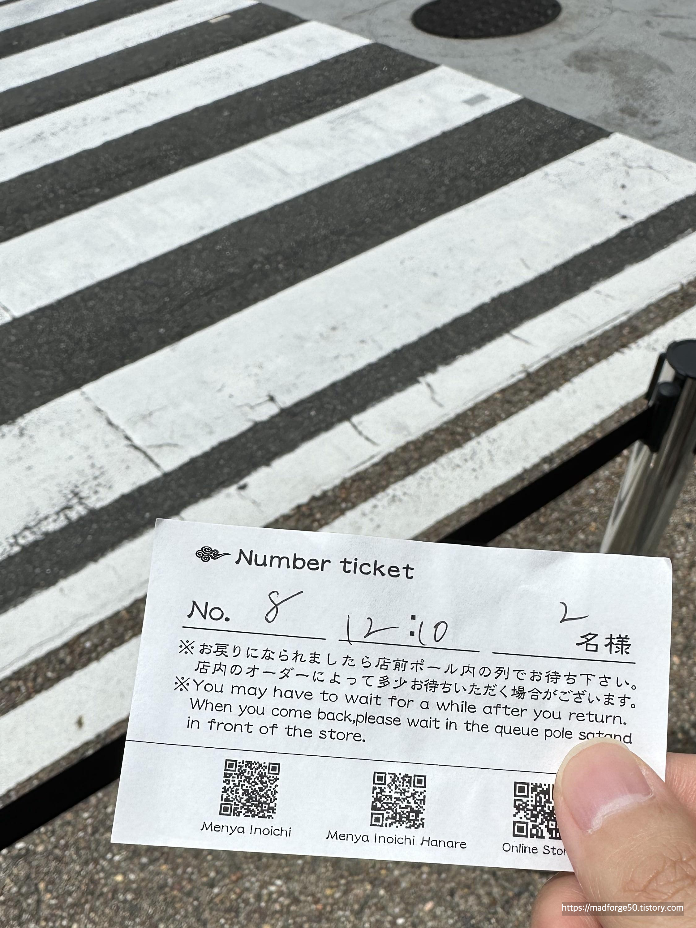 하지만 이게 기다림의 끝은 아니다. 티켓 시간인 12:10분에 가면 그때부터 진짜 줄의 시작이다. 12:10분 시간대에 한 6~7팀 정도를 받는 것 같았다. 이 라멘집의 내부는 찍을 수가 없었기 때문에 말로 설명을 하자면 카운터(닷지)에 최대 8명 정도 앉을 수 있고 카운터가 아닌 일반 식탁 좌석이 4인용 2개가 있다. 즉, 큰 식당이 아니기 때문에 사람들을 많이 받을 수 없고 사람들은 유명세에 기다리기 몰리기 때문에 줄이 긴 것 같다.