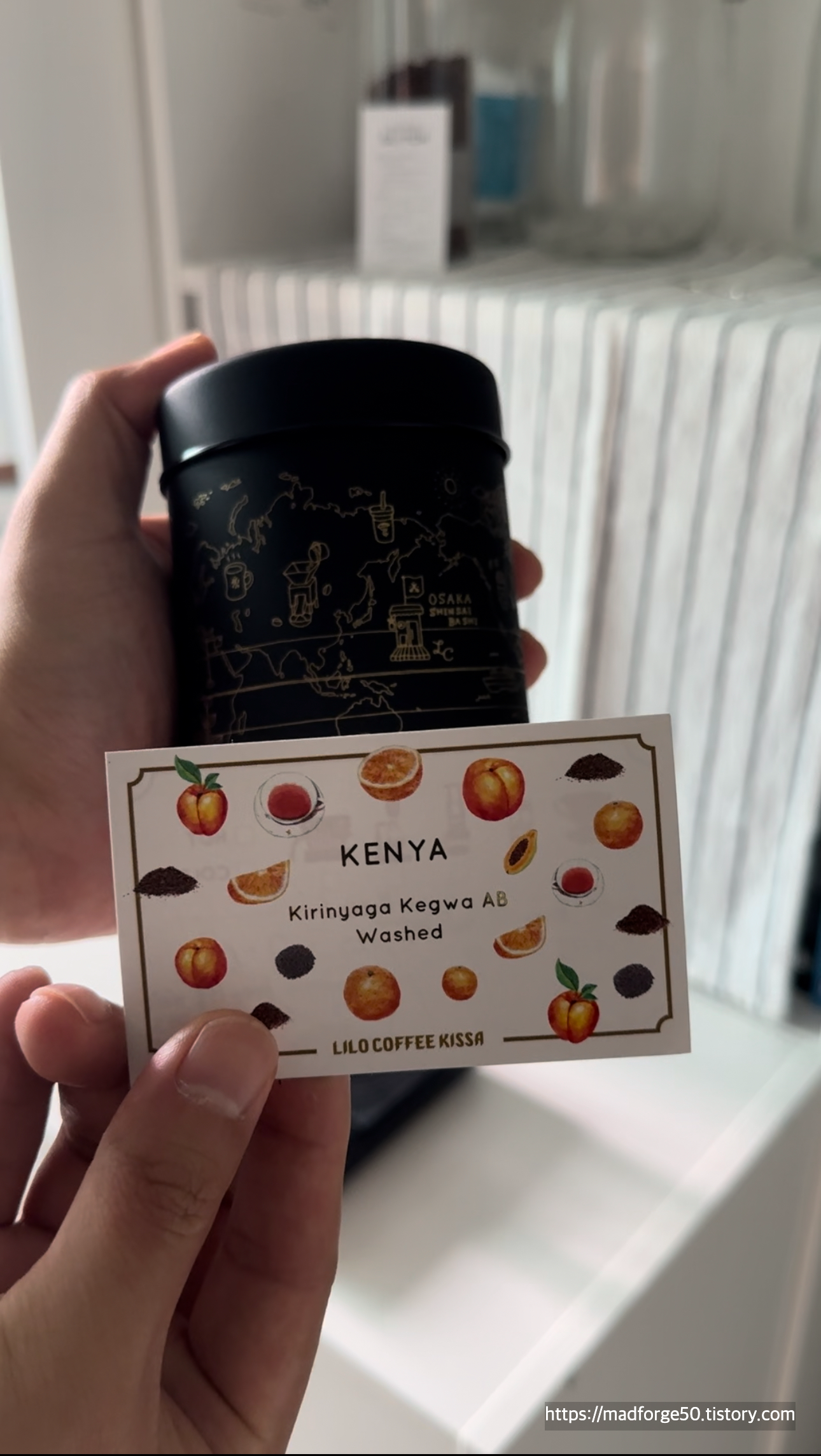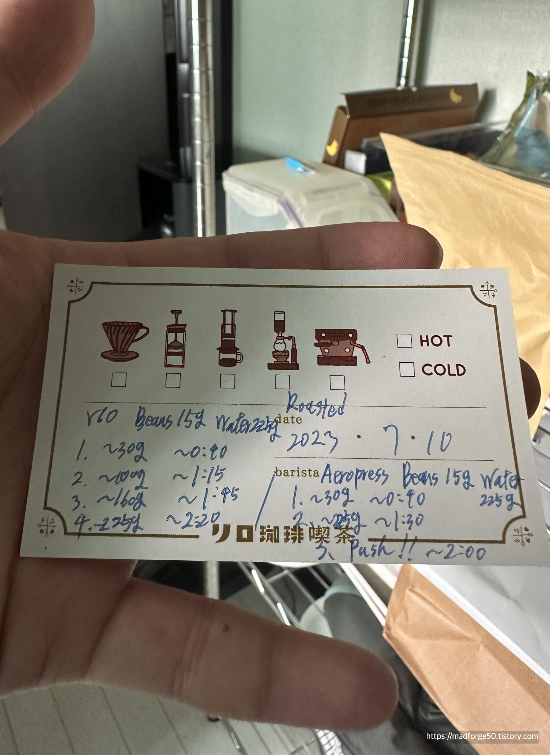 커피를 먹고 우리가 마셔 보지 않은 원두와 지인들에게 선물할 커피들을 구매하기 위해서 카운터로 갔다. 원두를 구매하면 틴캔에 원두를 가득 담아주는데 150g 정도 준다. (집에서 달아보니... 143g으로 조금 적었다. ㅜㅜ) 그리고 recipe를 주기 전에 집에서 어떻게 커피를 내리는지 물어본다. 우리는 집에서 V60 디켄터를 사용하고 있기 때문에 V60의 레시피를 받았고, 에어로프레스도 나쁘지 않다고 하여 에어로프레스의 레시피도 함께 써주었다.