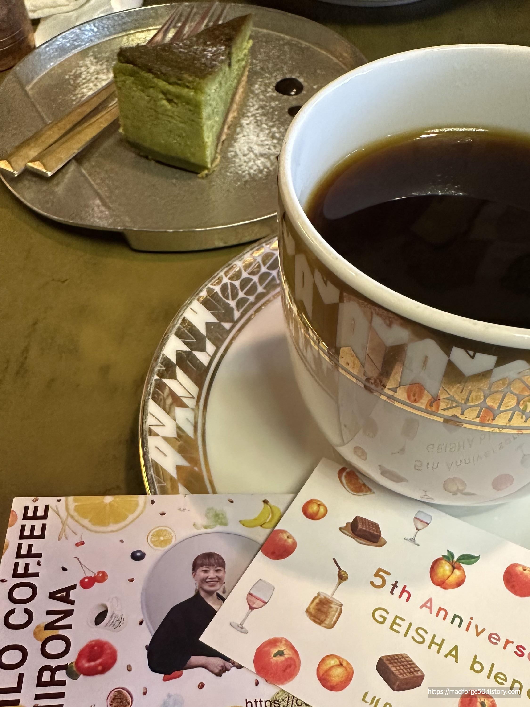 물론 커피가 아닌 음료도 팔고 있긴 하지만... 커피가 유명하니 커피를 먹도록 하자. 우리는 릴로 커피 5주년 기념 Geisha Blend를 에어로프레스로 내린 것과 Colombia Coconut Lemonade를 V60 핸드드립으로 시켰다. 그리고 디저트도 하나 먹었는데 녹차 치즈케이크를 주문했다.