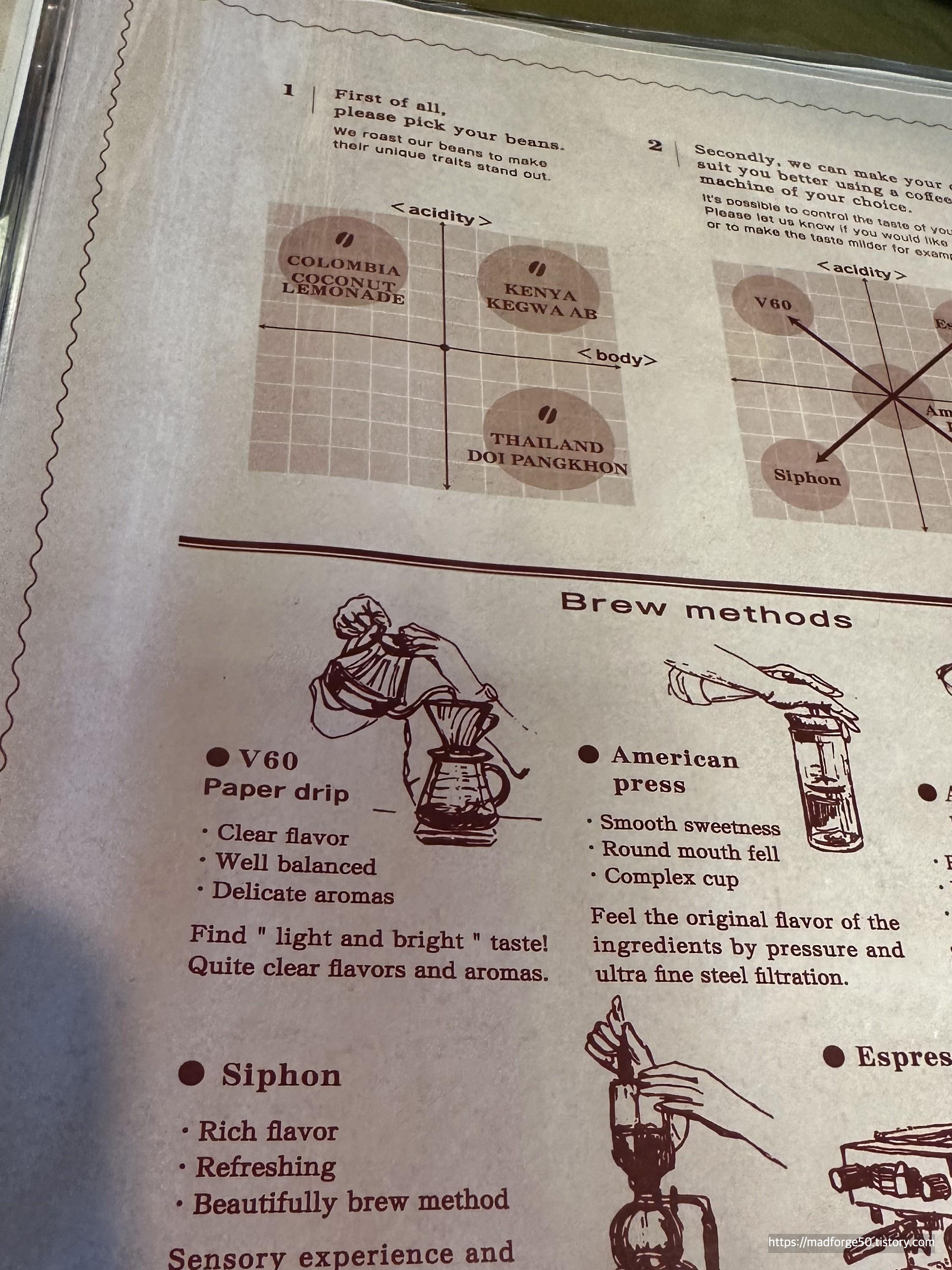 물론 릴로 커피 로스터스점보다 원두의 종류가 적었지만 릴로 커피 킷사점에서는 4가지 정도의 원두를 고를 수 있었다. 대부분의 원두 아래 추천하는 커피 내리는 방식이 있기 때문에 추천하는 방식을 따라가면 쉽겠지만 자신이 원하는 방식이 있다면 한번 시도를 해보는 게 좋다. 여기서는 커피를 내리는 방식을 5가지로 제공을 하고 있는데 V60 핸드드립, 아메리카 프레스(프랜치 프레스), 에어로프레스, 사이폰, 에스프레소이다. 각각의 커피 추출 방식은 장점이 있기 때문에 원두 각각의 캐릭터에 맞게 추천을 하고 있는 것이다.