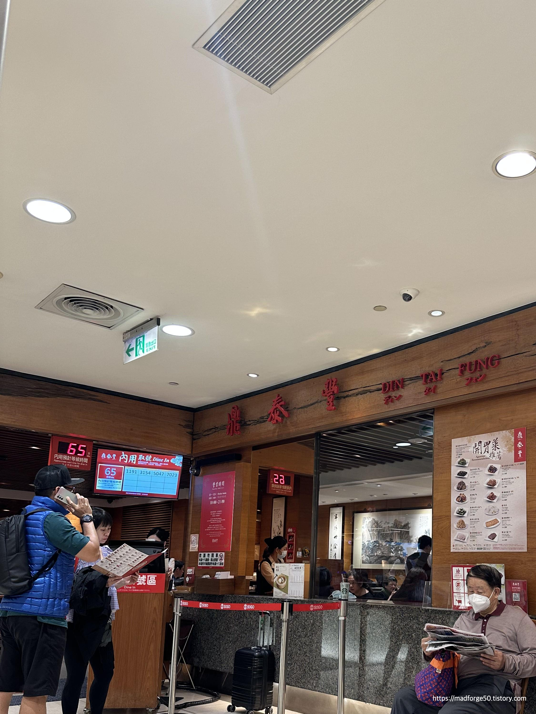 그렇게 커피를 한잔 먹고 나서 늦은 점심을 먹기 위해서 Wenhu Line을 타고는 Zhongxiao Fuxing역에 있는 Sogo 백화점으로 향했다. Sogo 백화점 지하 2층에 딘타이펑이 있는데 점심시간이 조금 지났음에도 웨이팅이 조금 있었다. 그래도 순환이 꽤나 빨라서 그렇게 많이 기다리진 않았다.
