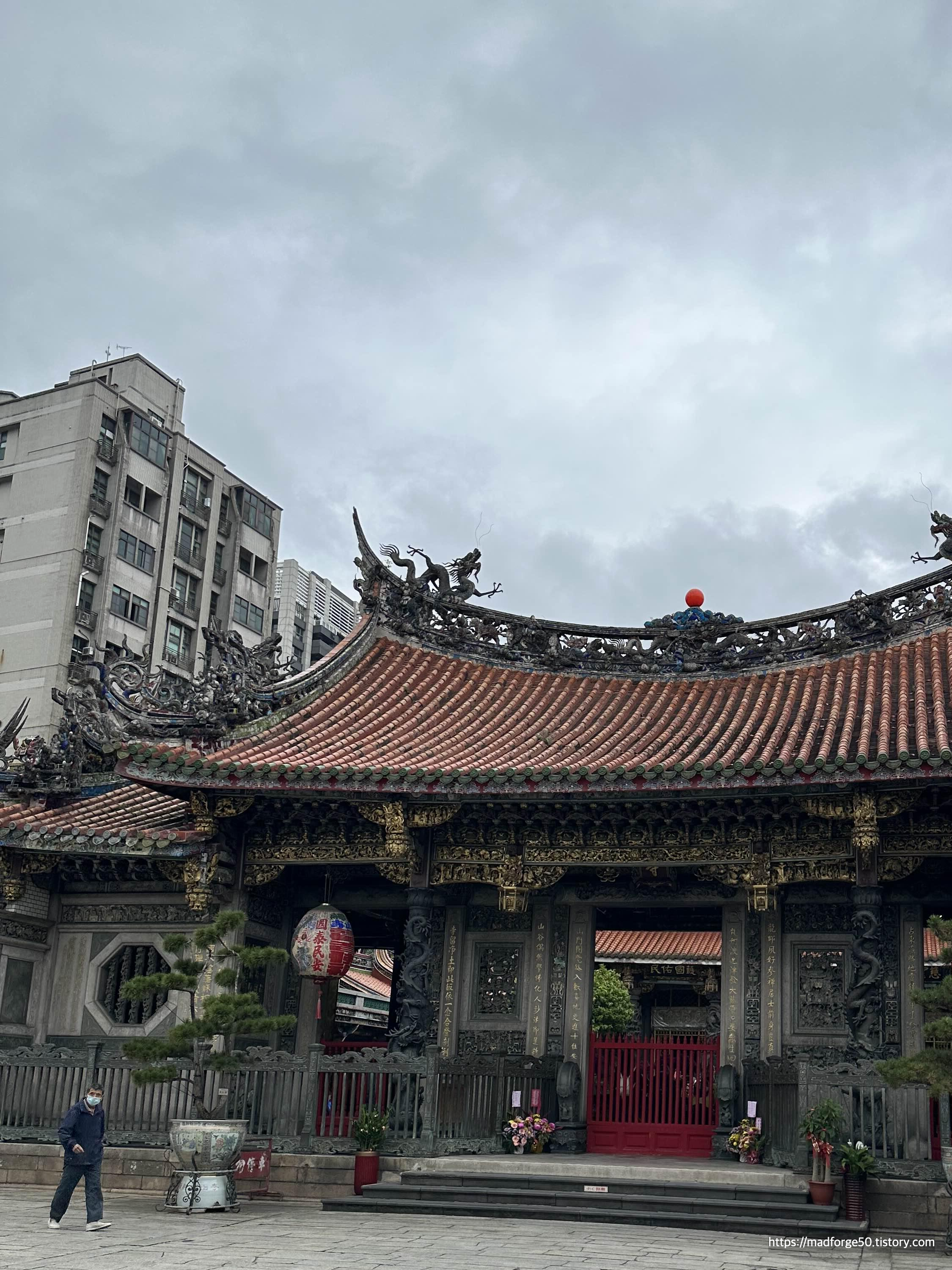 안쪽으로 들어가 보지는 못했지만 외관을 보는 것만으로도 예전 대만은 이런 느낌이구나 하는 것은 알 수 있었다. 그리고 계속해서 걸어 용산사로 향했다. 시먼딩에서 보피랴오거리, 용산사까지는 생각보다 걷는 게 오래 걸렸다. 날씨도 약간 쌀쌀하고 스산한 분위기가 연출이 되었는데 용산사를 도착하니 그 느낌이 더 했다. 지금까지 관광스폿과 실제 운영 중인 신사, 성당, 교회를 여러 군데 가봤지만 이탈리아의 로마에 있는 성당을 제외하고는 이 정도로 관광객보다 실제 이 신사에서 참배를 하는 방문객이 더 많은 것은 처음이었던 것 같다.