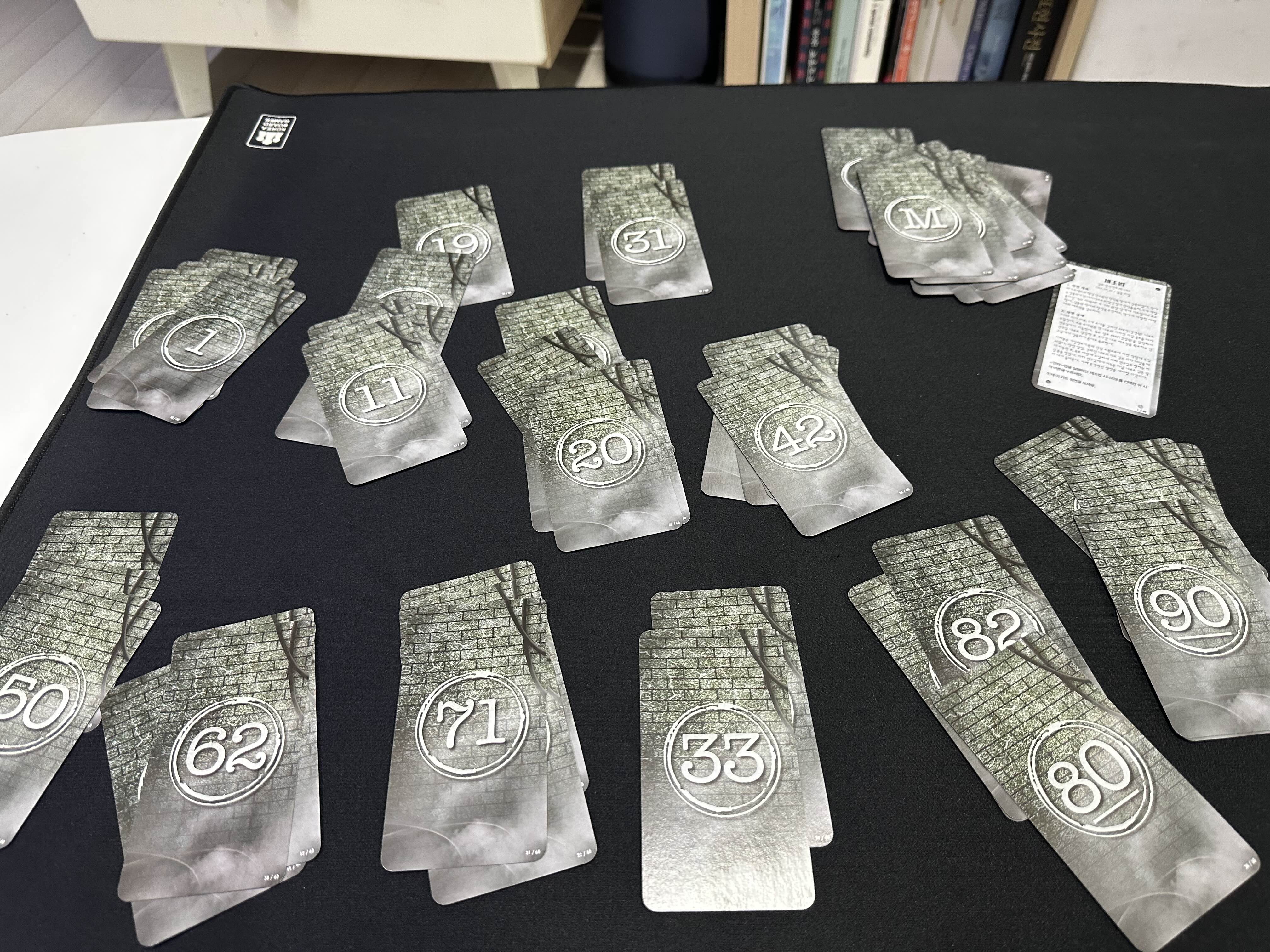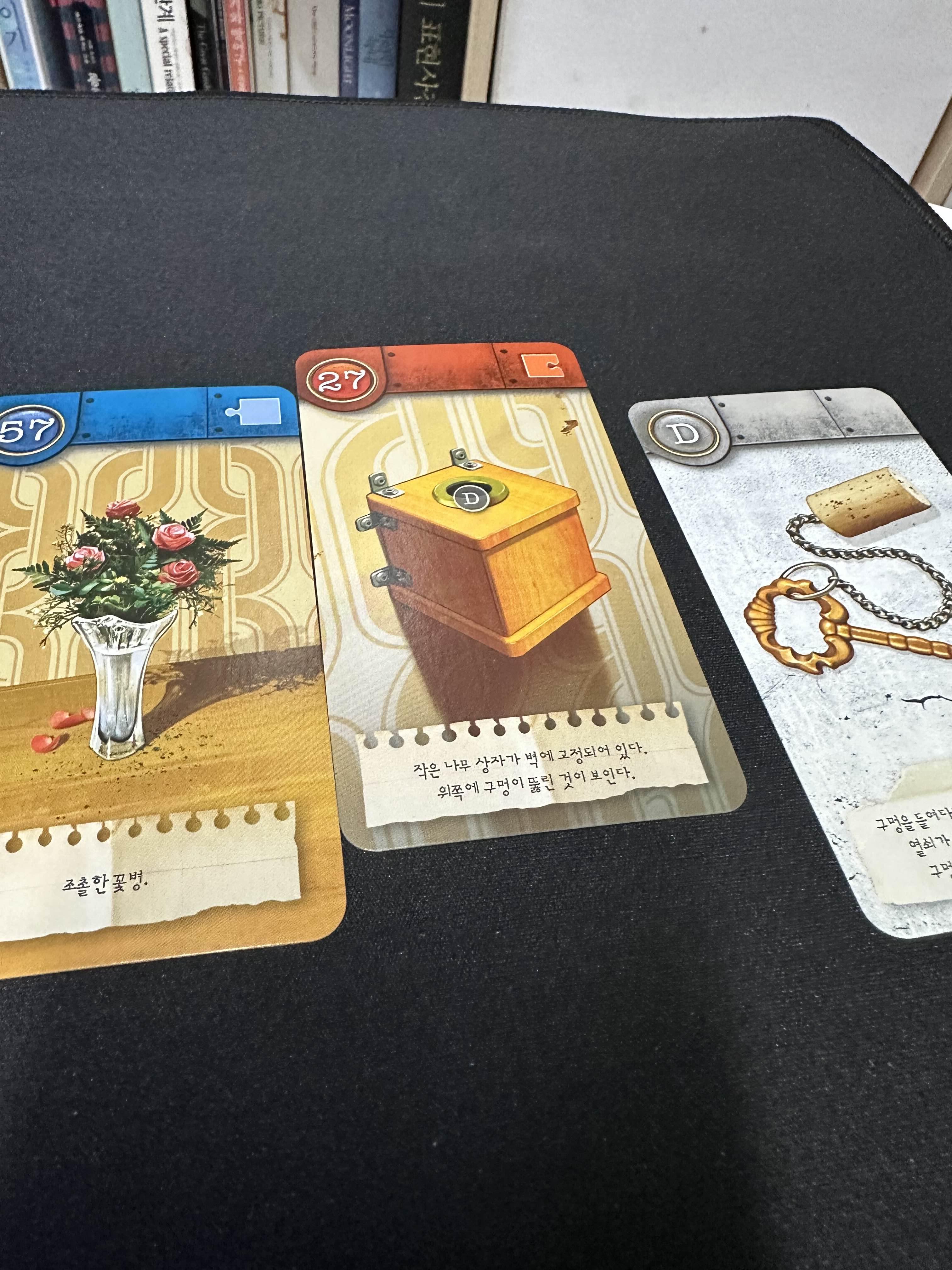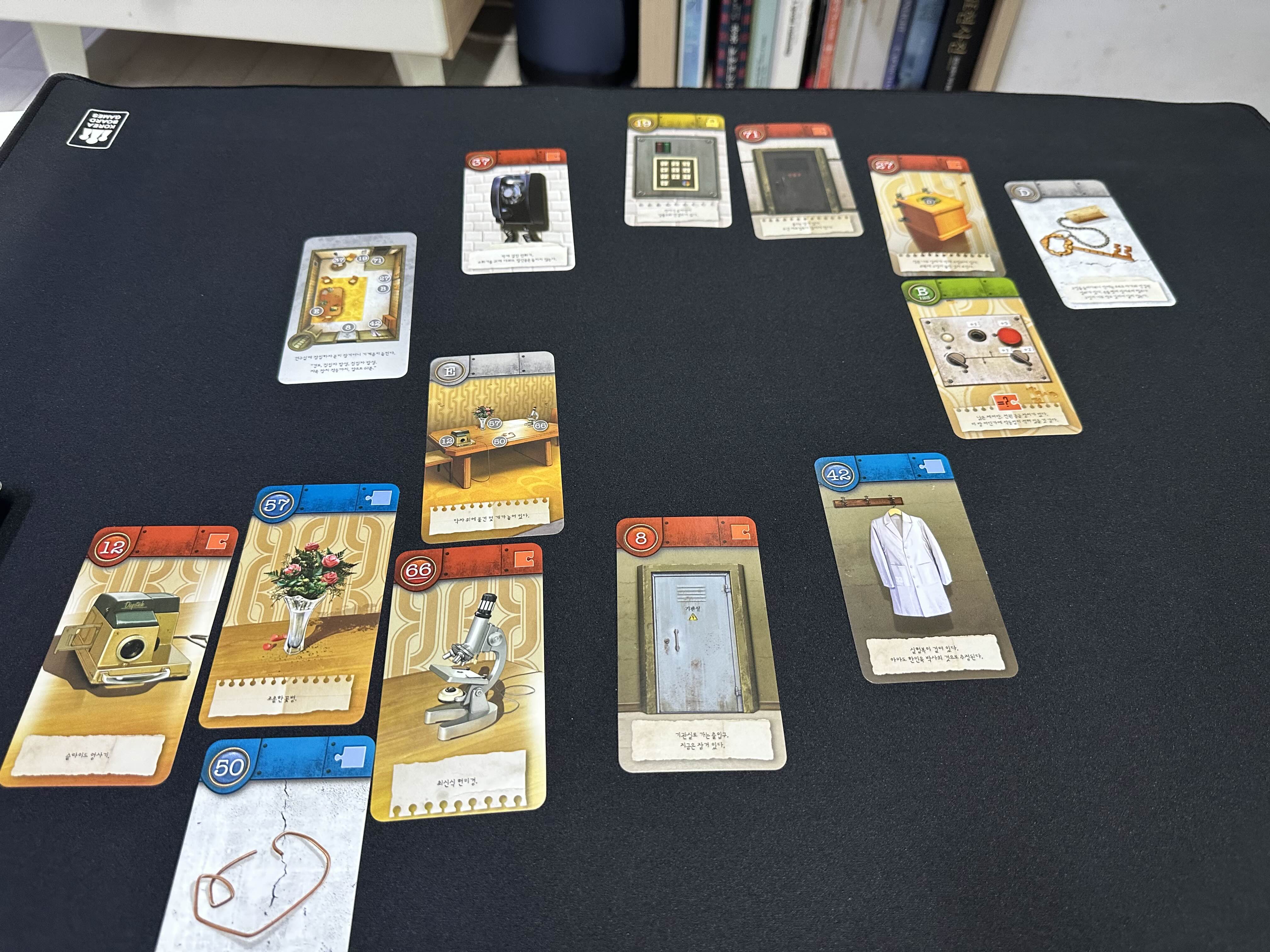 연구실의 경우에는 게임의 끝까지 가지고 있어야 하기 때문에 잘 놓는 것이 중요하다. 그래도 연구실 카드 자체에는 힌트가 없기 때문에 그렇게 크게 신경을 쓰지 않아도 되긴 한다. (몇몇 방 카드의 경우에는 구석구석 잘 살펴봐야 하는 방 카드들이 있다.)